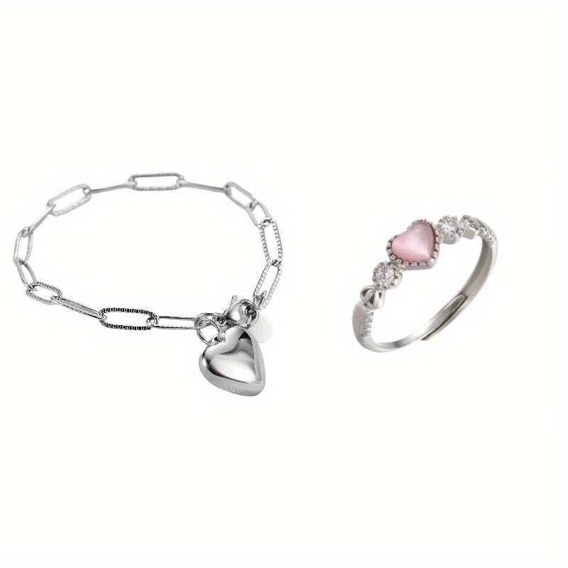 Women's Heart Charm Bracelet & Ring Set Stainless Steel Rhodium Plated