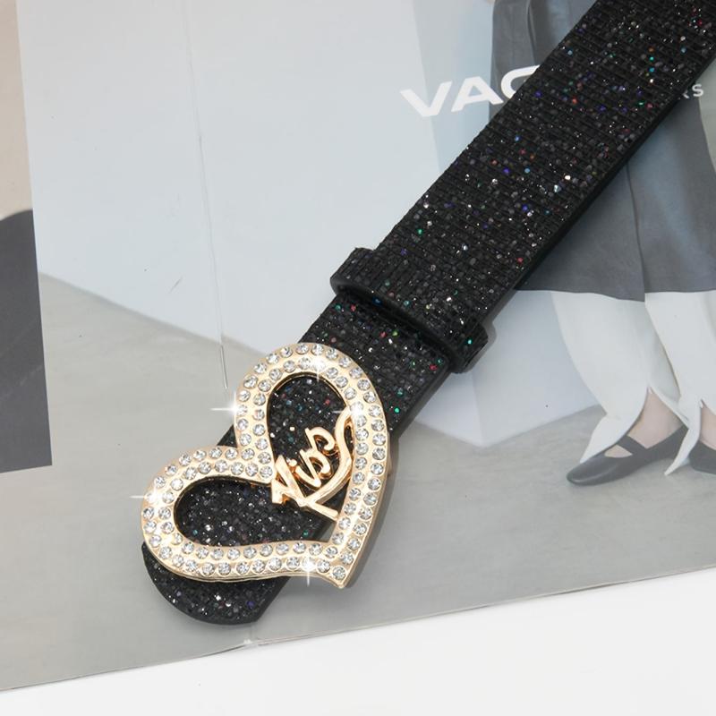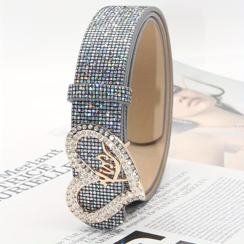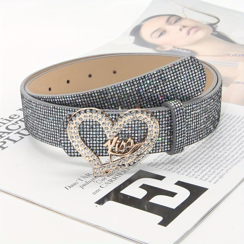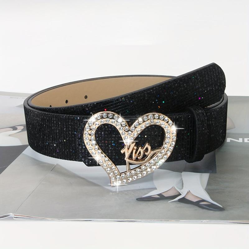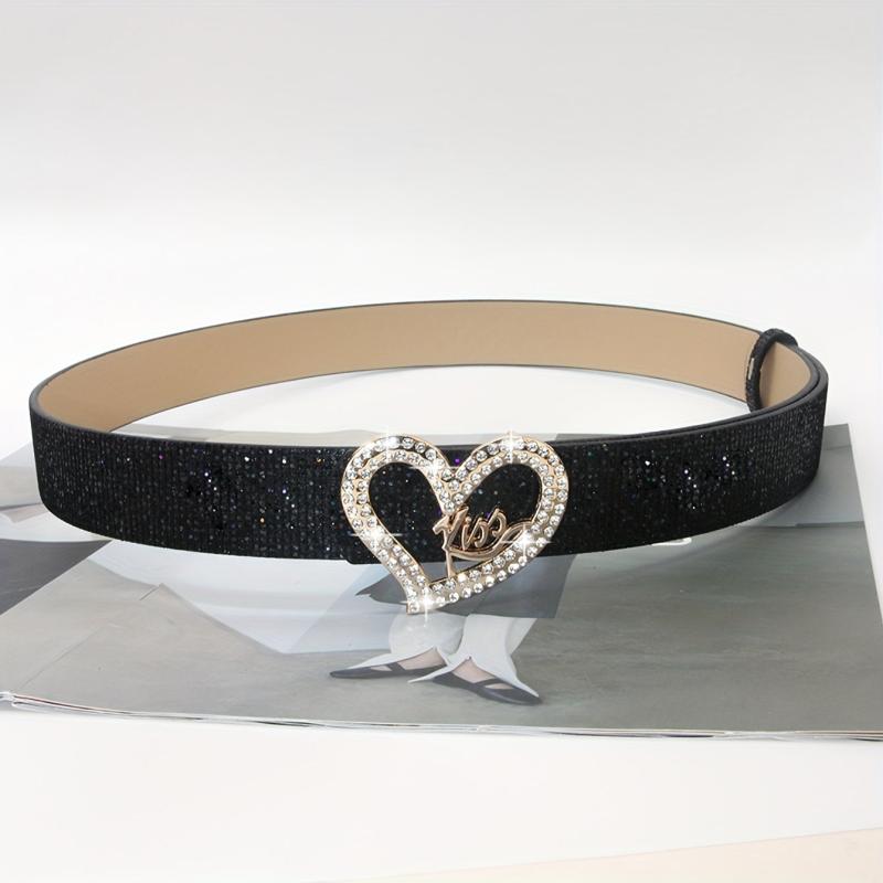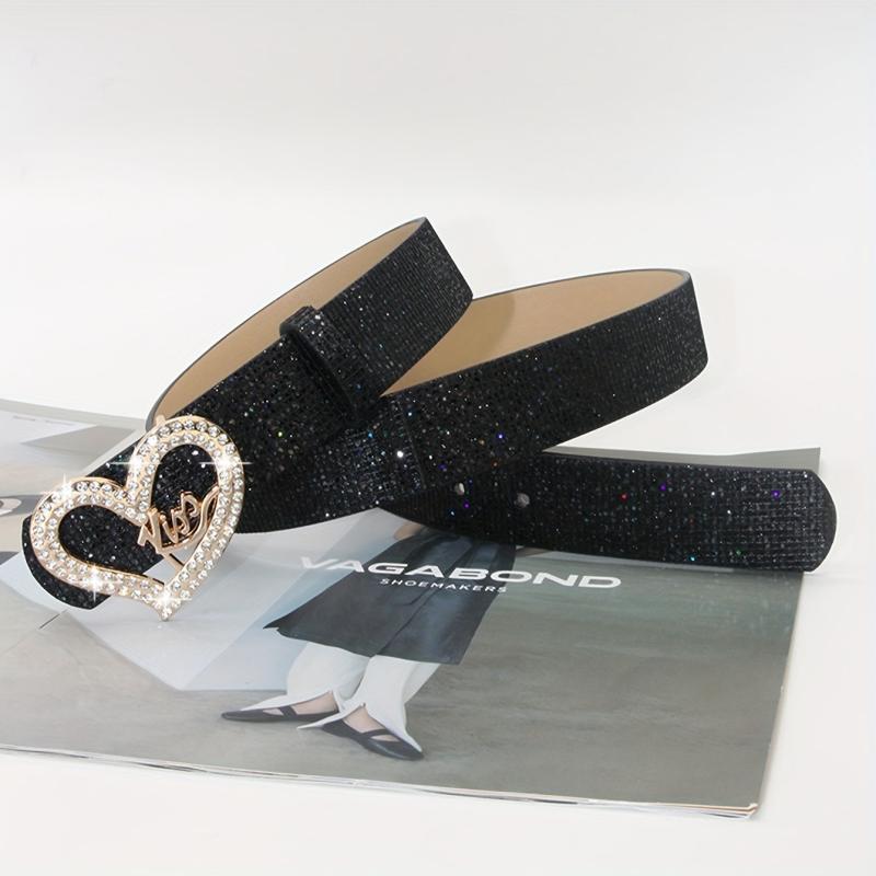 Add a touch of glam to your outfit with this stylish belt featuring heart rhinestone studs and sequin embellishments on faux leather material.