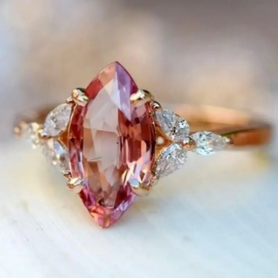 This stunning engagement ring set features marquise cut synthetic zirconia stones in a copper plated setting with 4 prongs. It's the perfect accessory for all seasons and makes a great gift for any occasion, especially for those born in July.