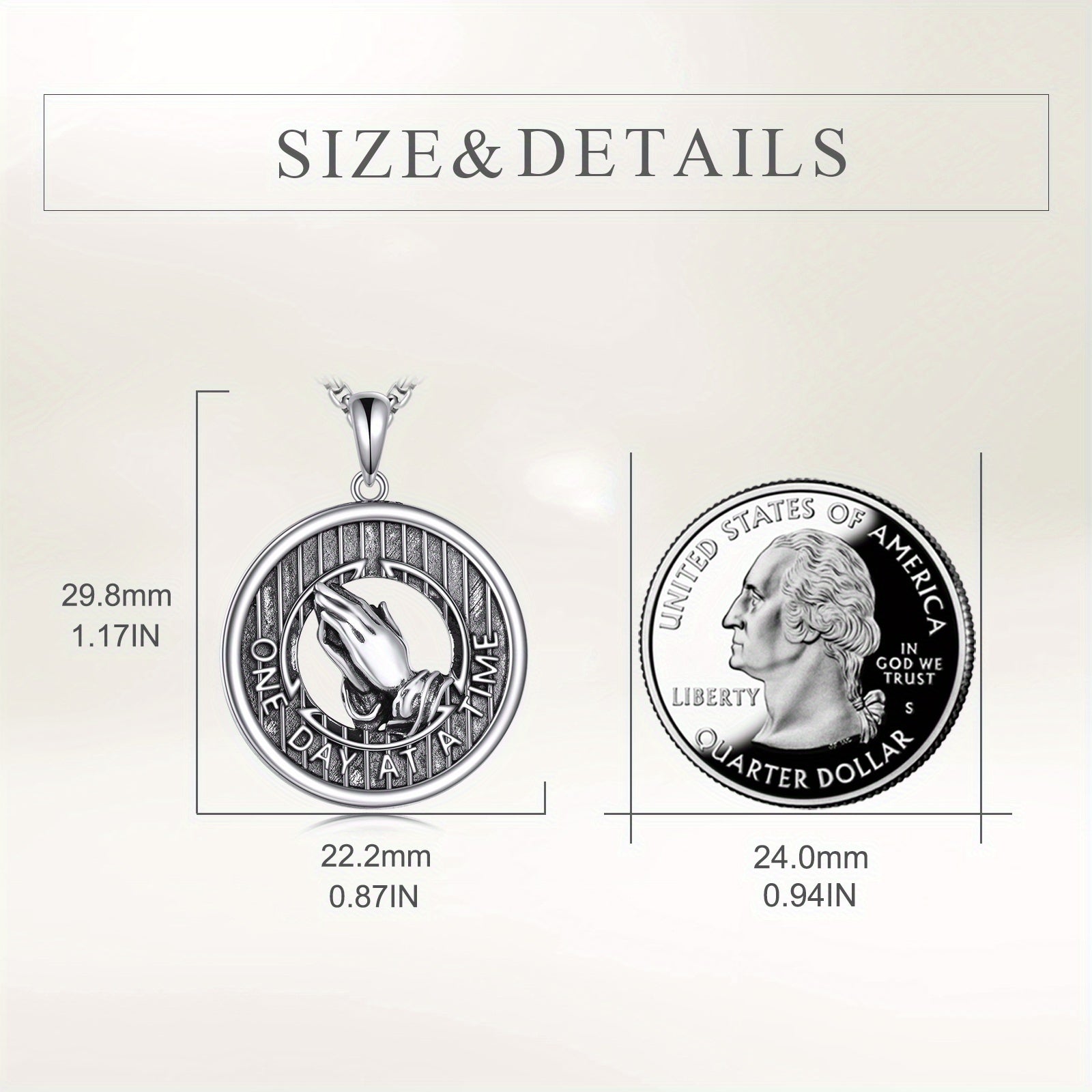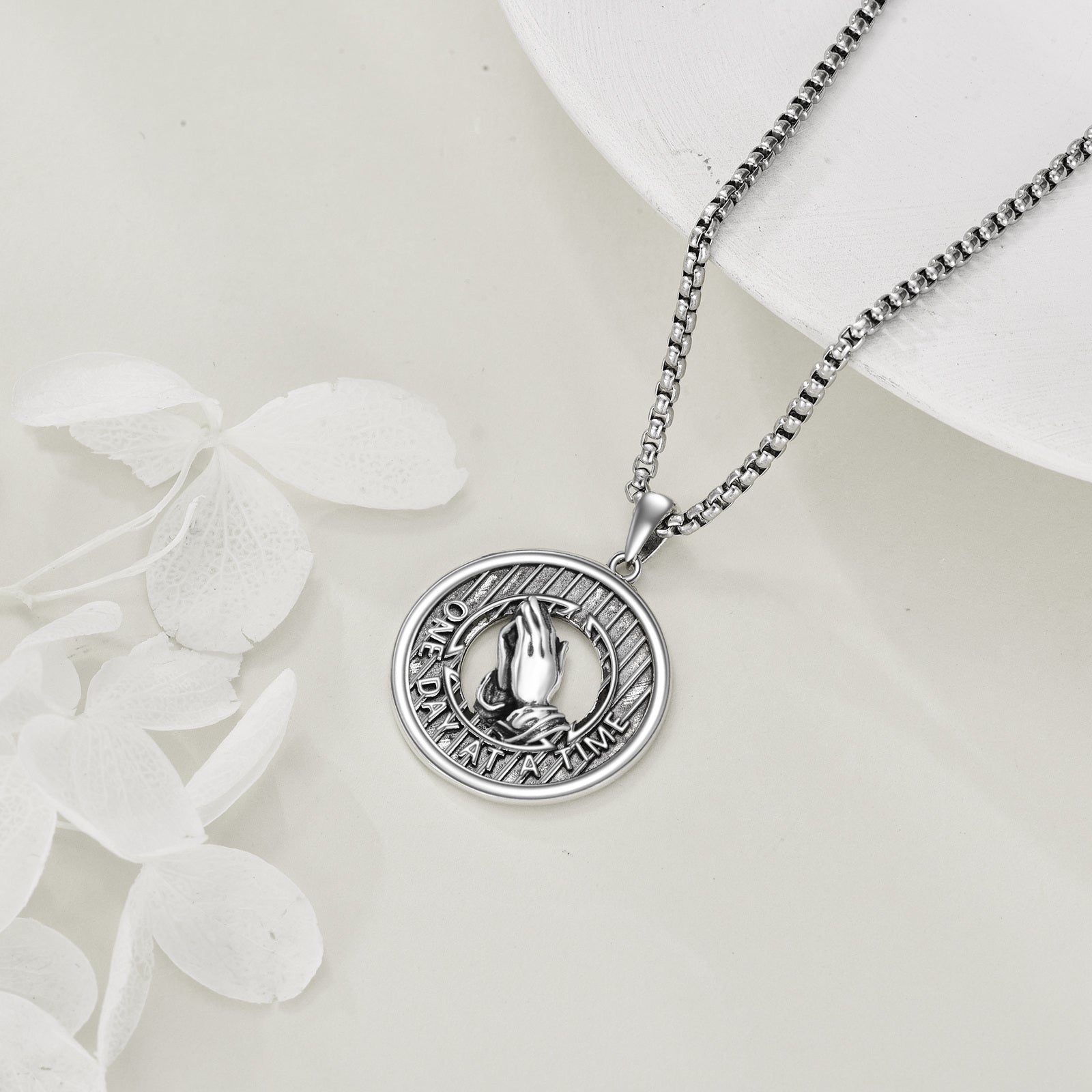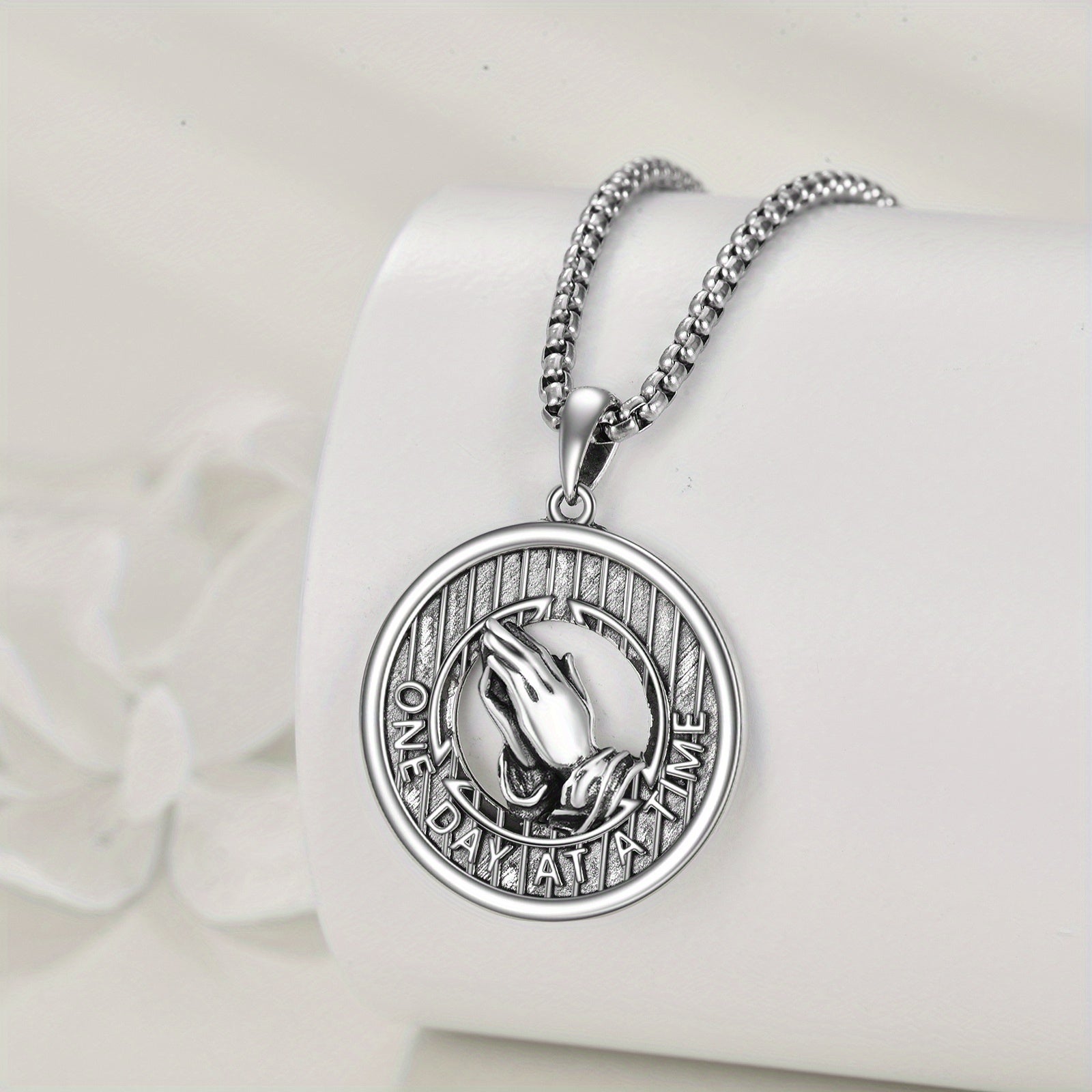 This beautiful necklace features the Serenity Prayer design with praying hands. A meaningful religious jewelry gift for mom.