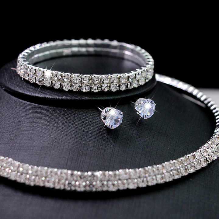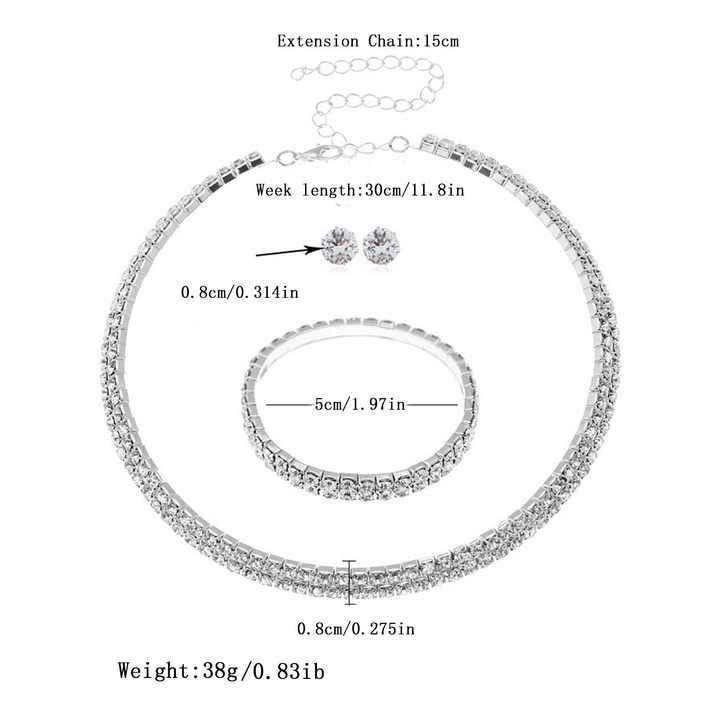 - Product Particulars: Crafted from high quality zinc metal plated with silver and embossed with cubic zirconia stones. The choker necklace comes with an adjustable fit, whereas the stud secured with push back closures. The bangle type bracelet is of stretchable type.