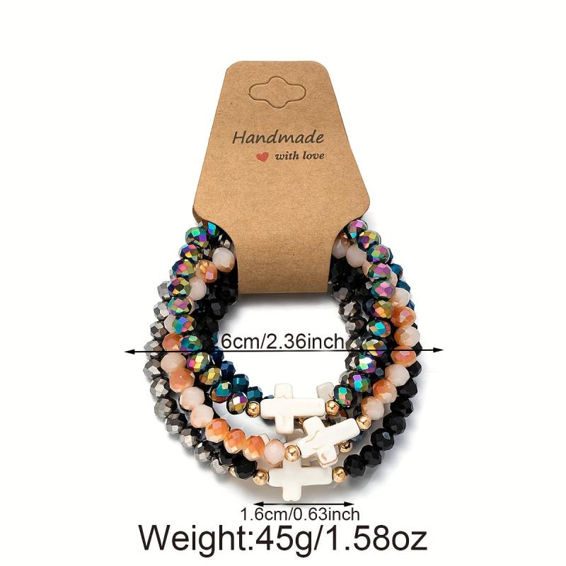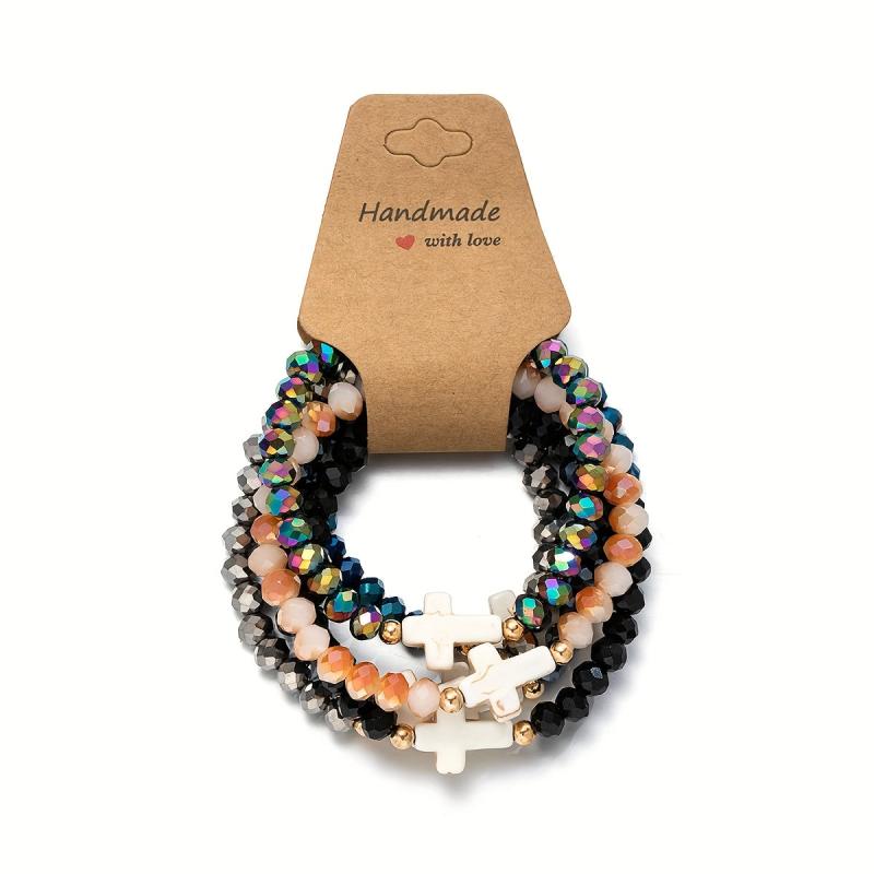 Vintage Glass Beaded Cross Bracelet Set - Elastic Stacking Jewelry