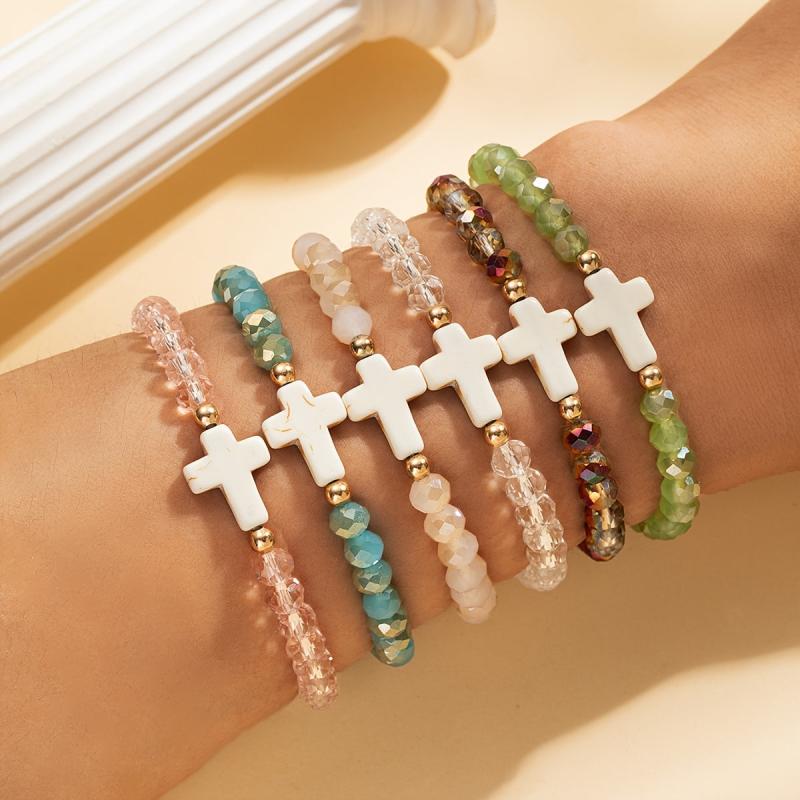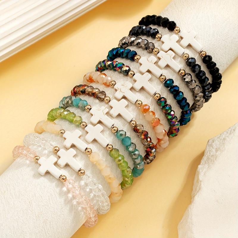Embrace vintage charm with this set of 12 colored glass beaded cross bracelets. Perfect for daily wear or as a gift for family and friends.