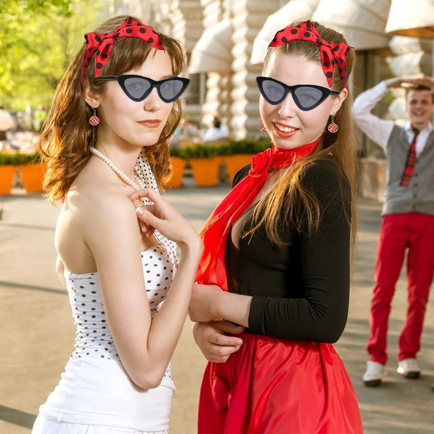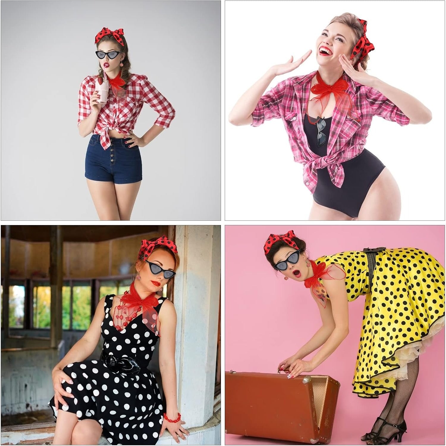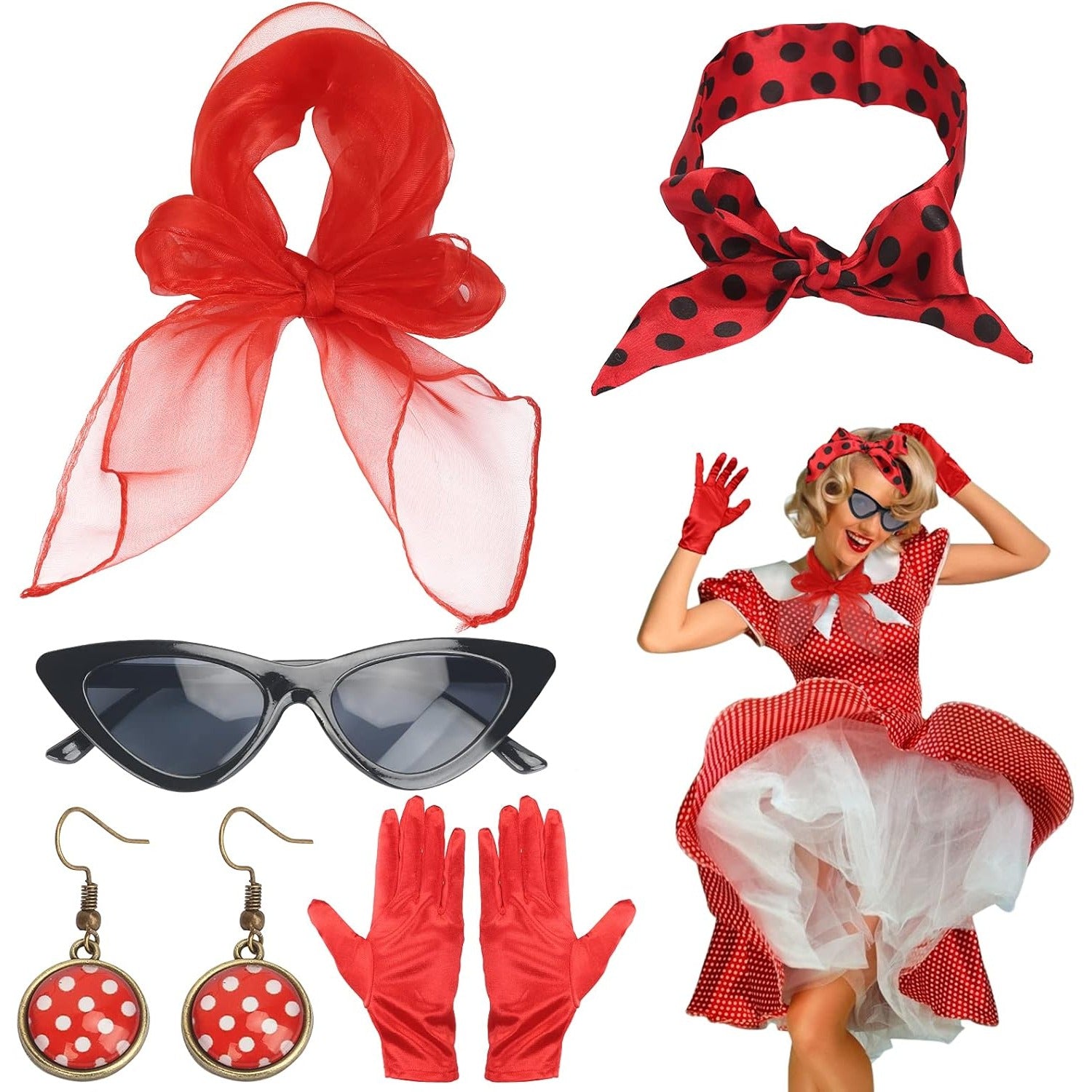 Complete your 1950s fancy dress outfit with this set of retro accessories. Includes polka dot bandana tie, headband, earrings, scarf, and cat eye glasses. Perfect for a French women costume look.