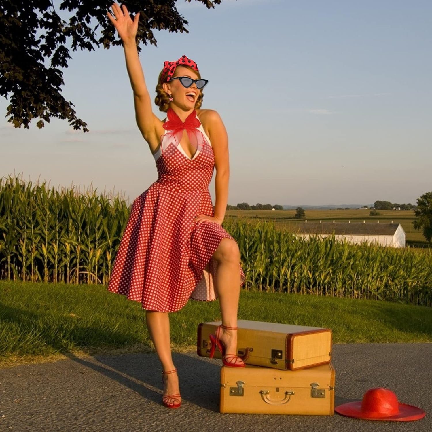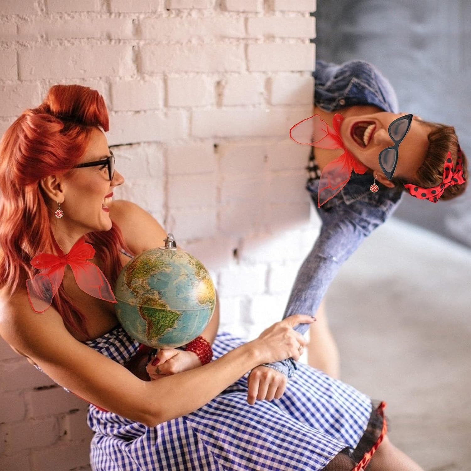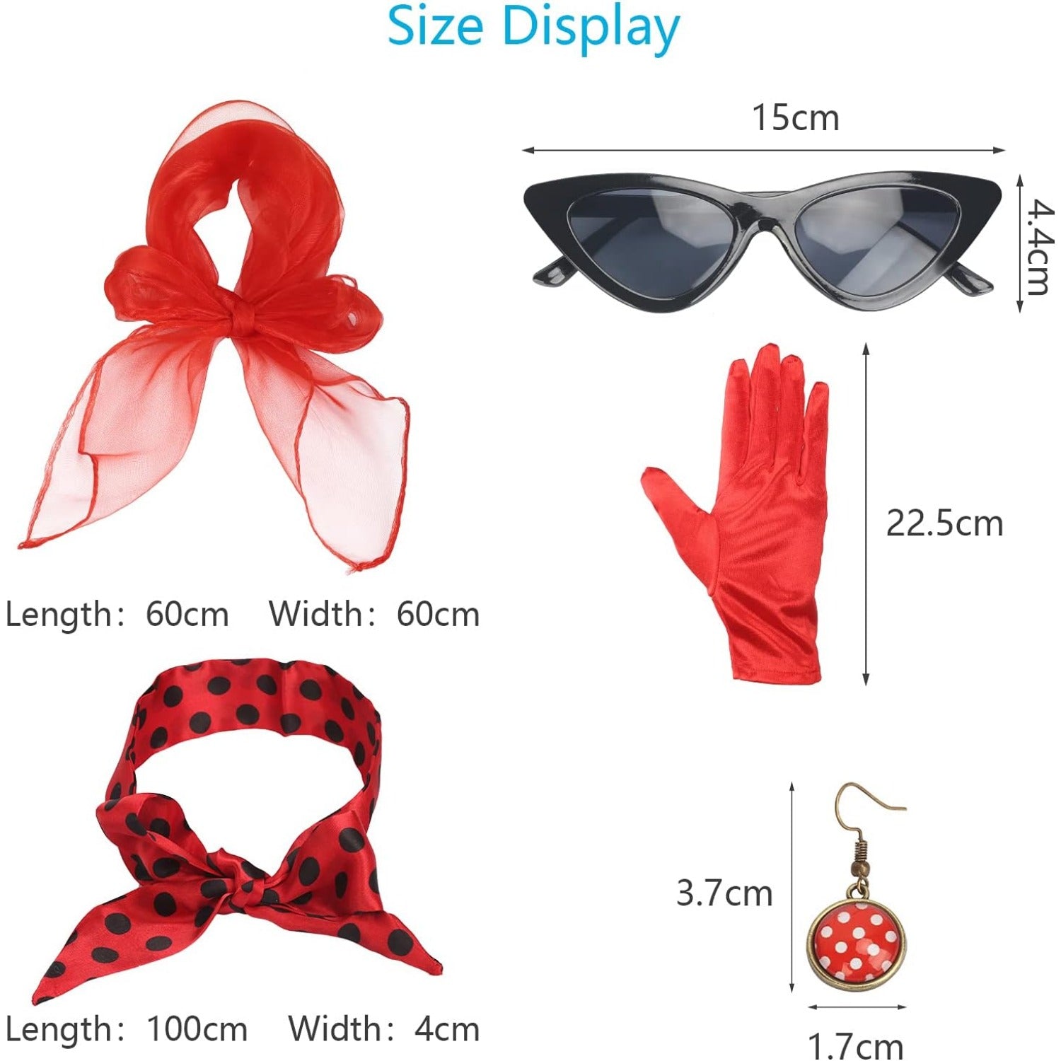 Complete your 1950s fancy dress outfit with this set of retro accessories. Includes polka dot bandana tie, headband, earrings, scarf, and cat eye glasses. Perfect for a French women costume look.