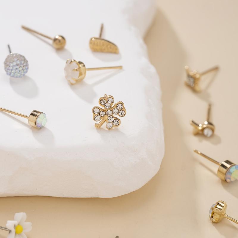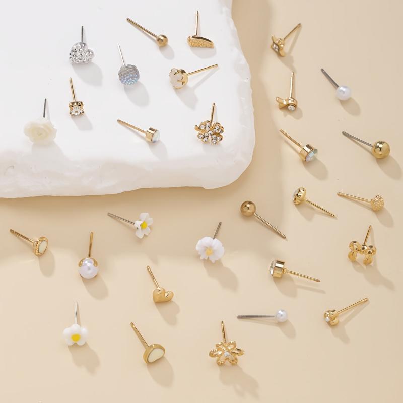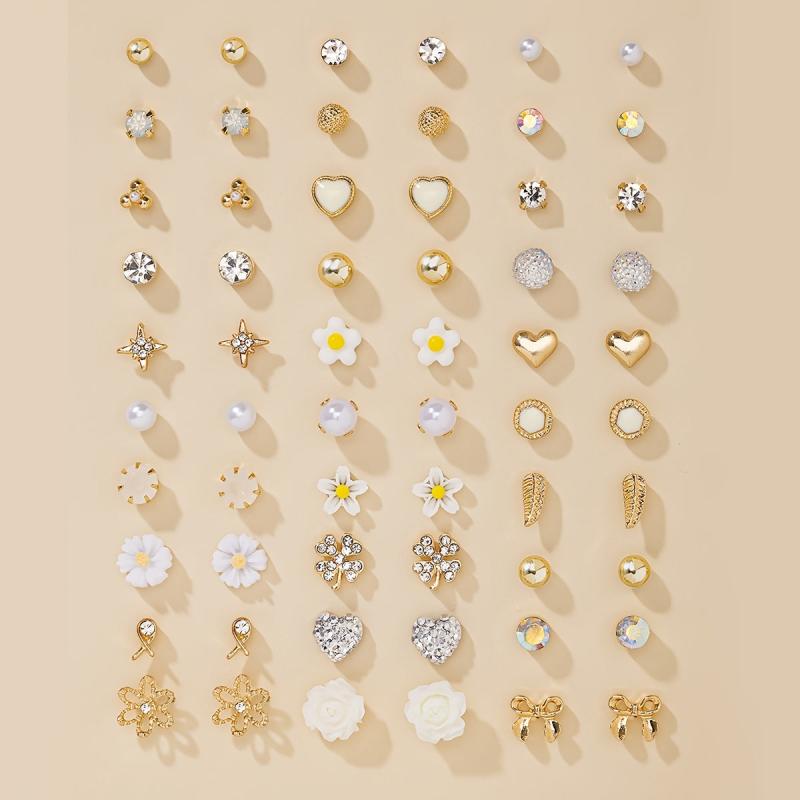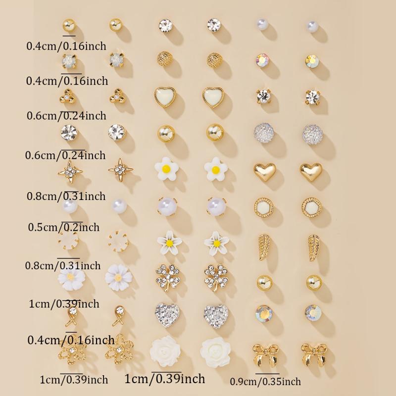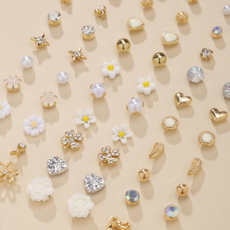 Elevate your vacation style with this set of 60 intricate metal and resin earrings featuring daisy, bow, rhinestone, heart, and leaf designs. Perfect for adding a touch of elegance to your holiday look.