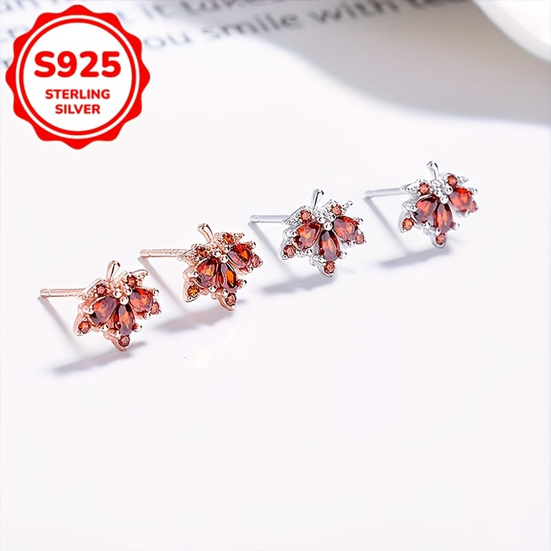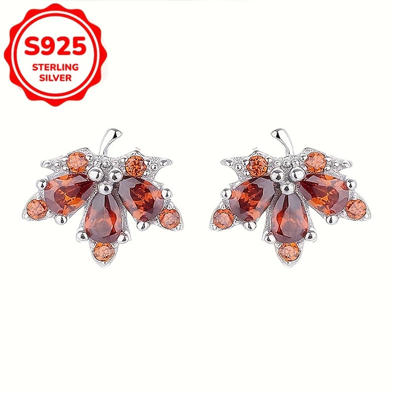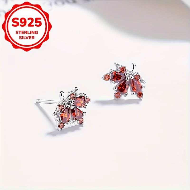 925 Sterling Silver Maple Leaf Stud Earrings with Red Rhinestones