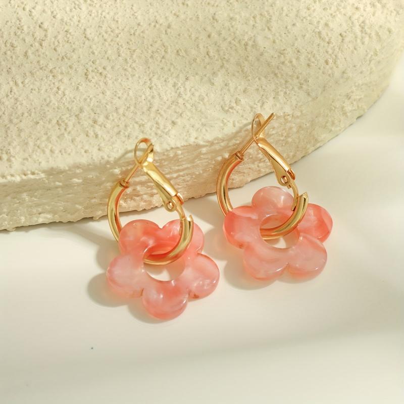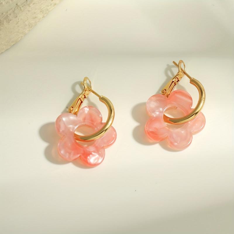 • Stylish acrylic earrings with glittery pink five flower pendants