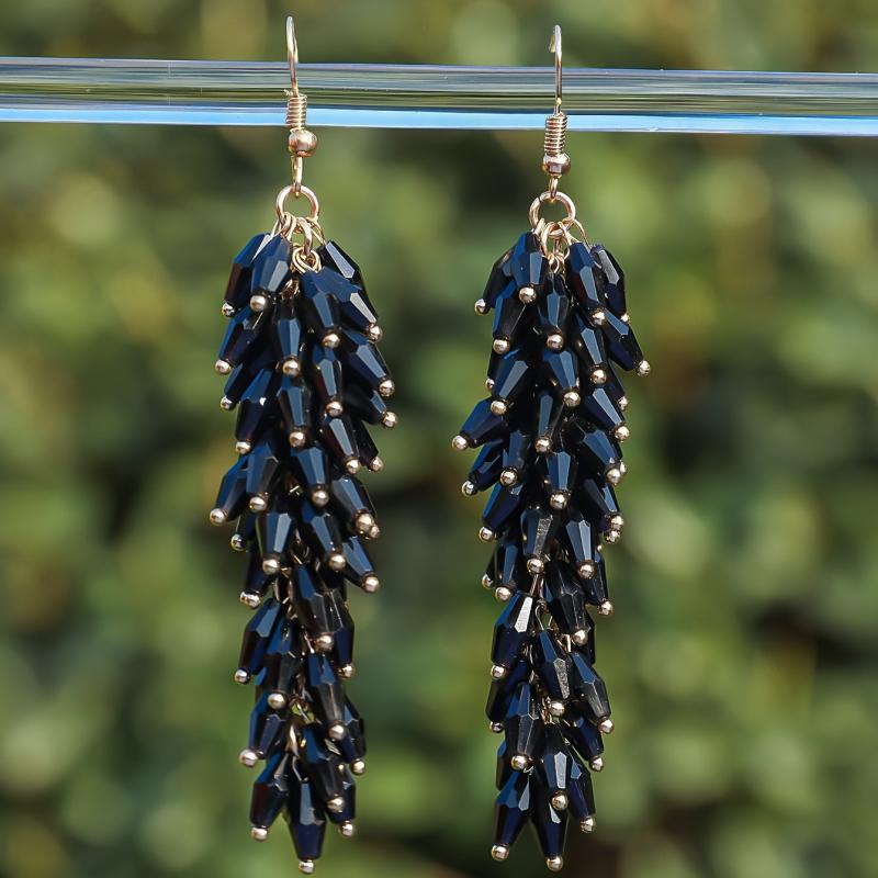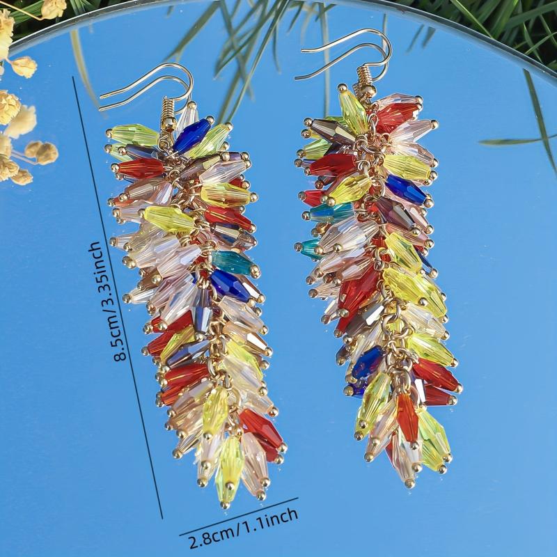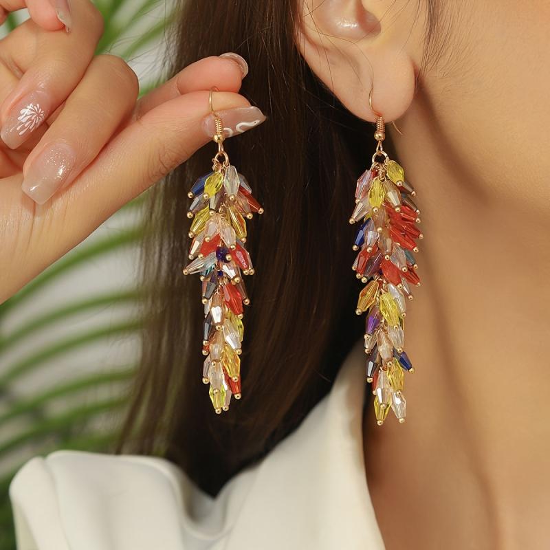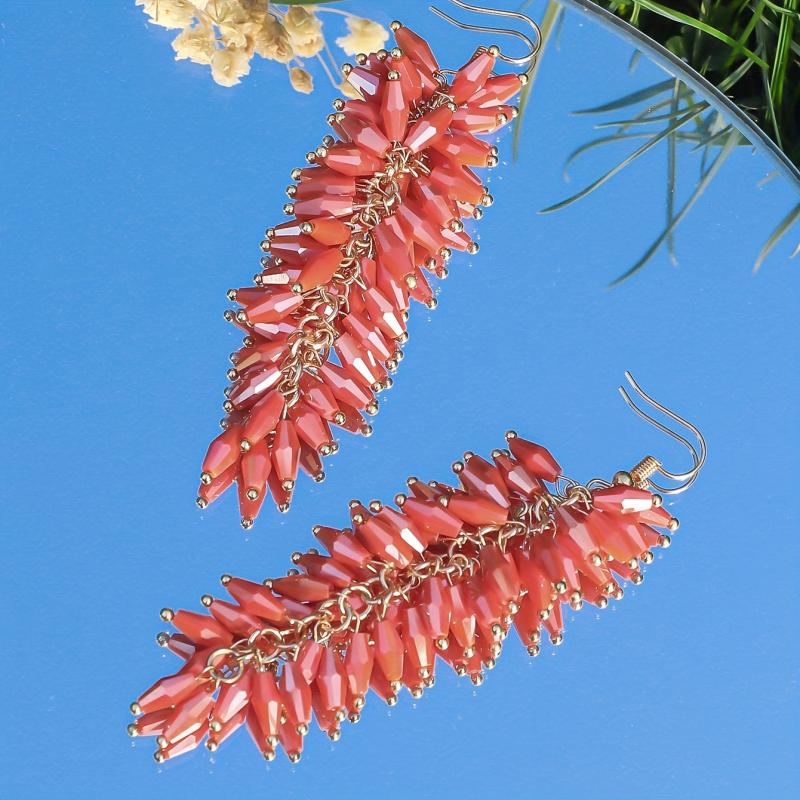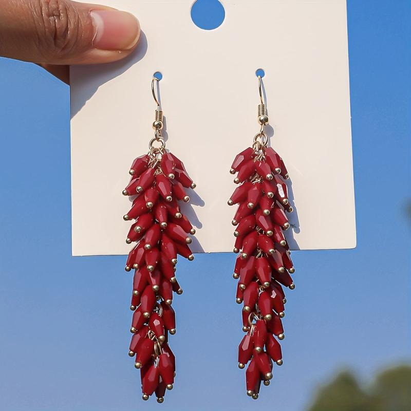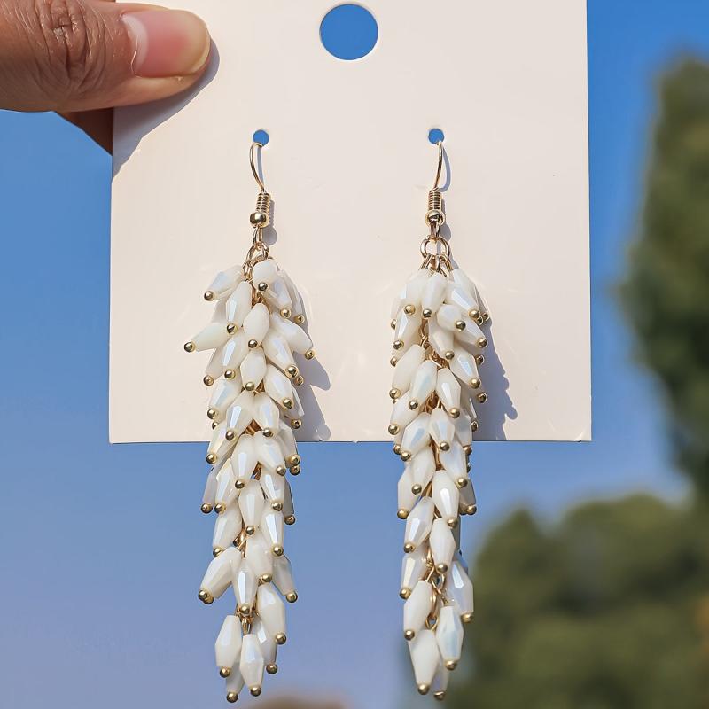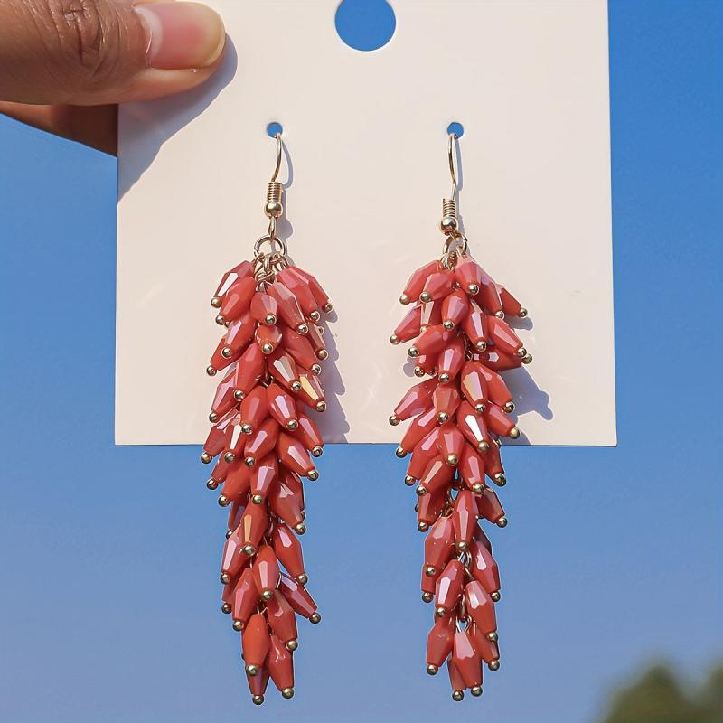 Vintage-inspired drop earrings featuring a pair of long tassel earrings with bohemian beads and pearl accents. Perfect accessory for casual attire or vacation outfits.