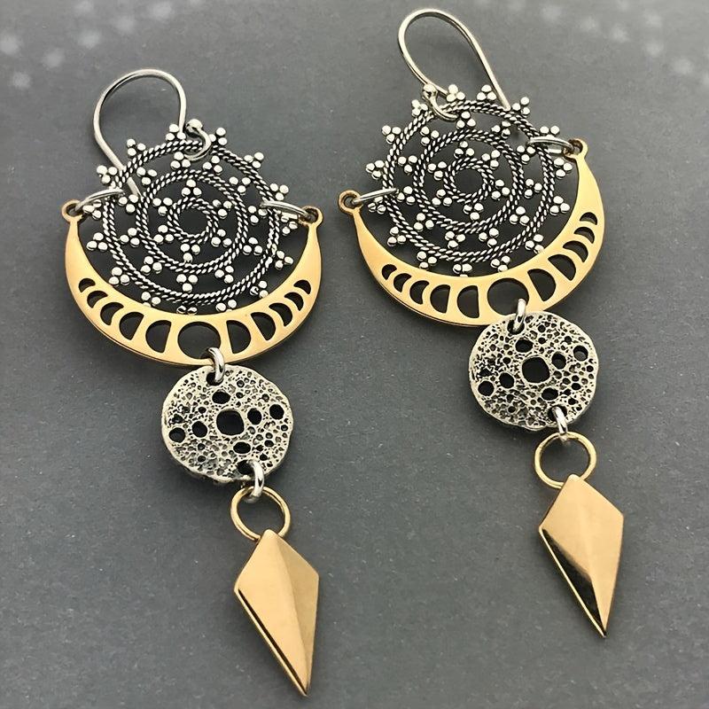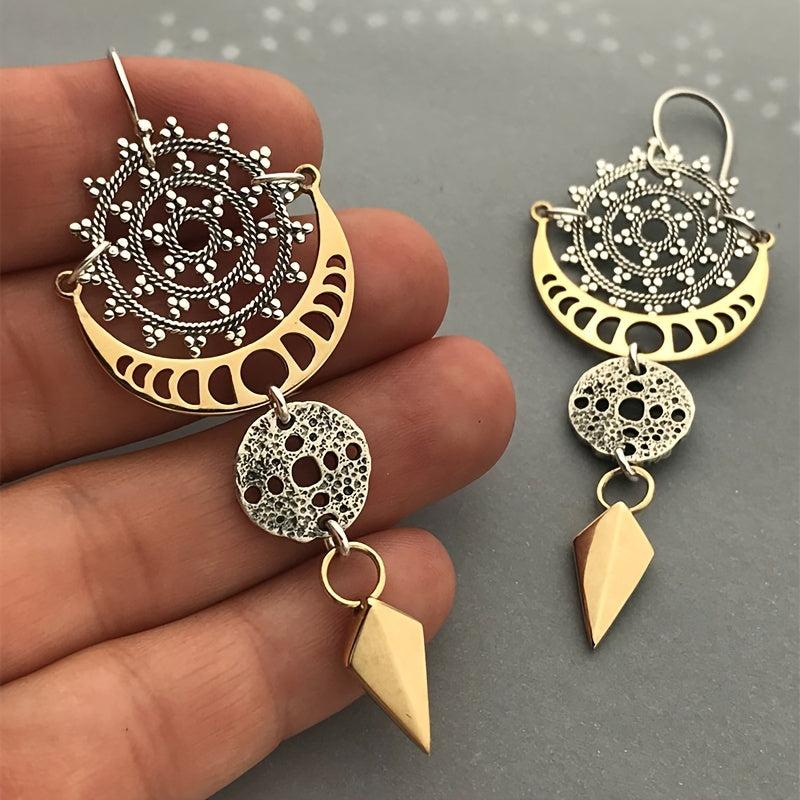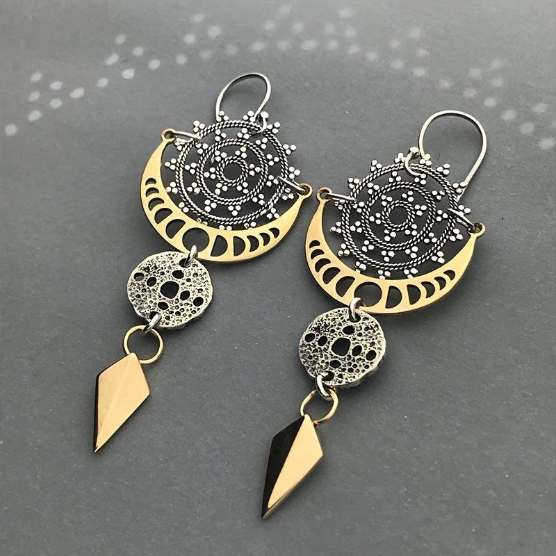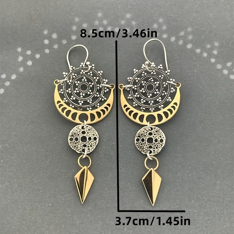 Add a touch of vintage charm with these celestial-themed dangle earrings featuring a golden circle pattern and moon texture. Perfect as a gift for women and girls.