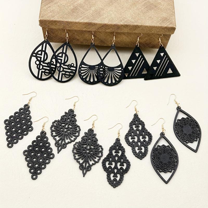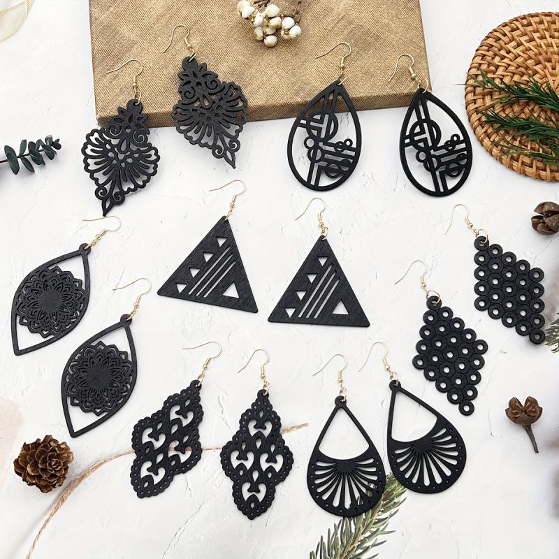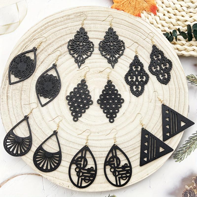 Bohemian Retro Hollow Wooden Pendant Earrings Set