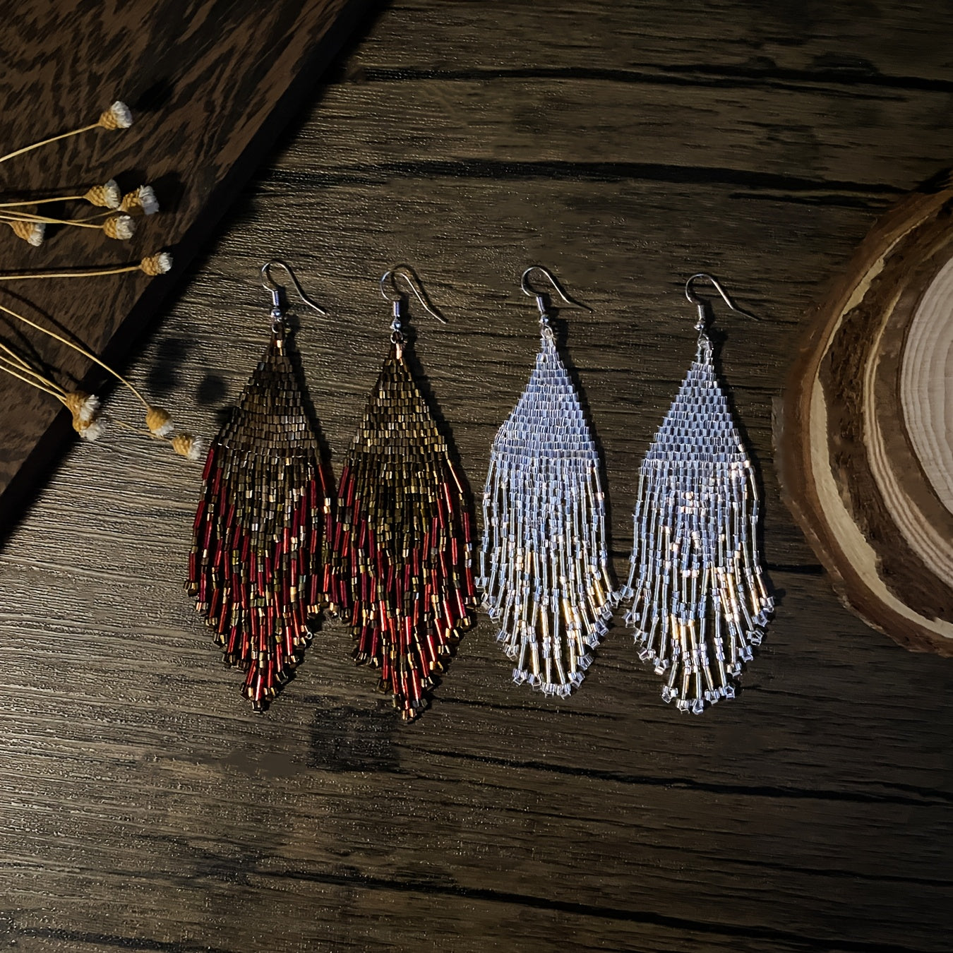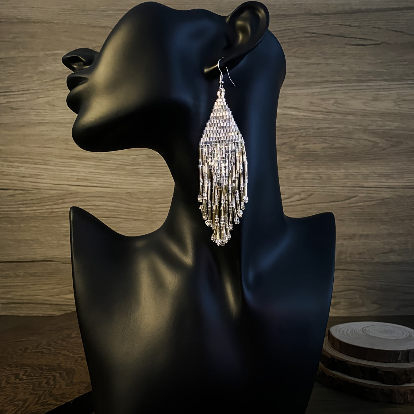 These vintage-inspired tassel earrings feature a geometric pattern with intricate beaded detail. Hand-woven for a unique and bohemian look.