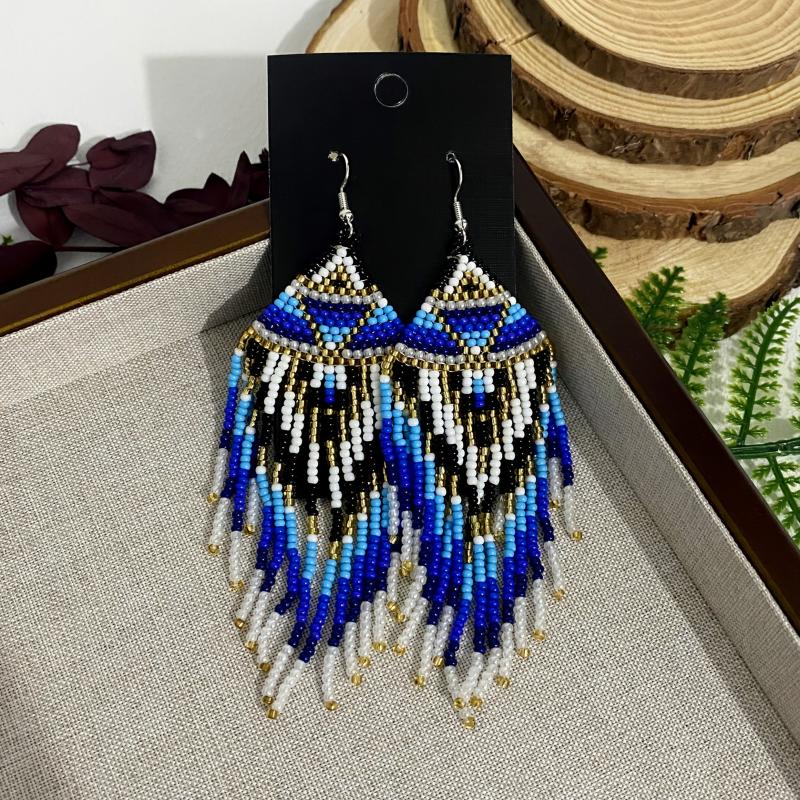 Chic and stylish tassel earrings with golden geometric beads, perfect for daily wear or gifting. Handcrafted with seed beads, these earrings are versatile for holiday outfits.