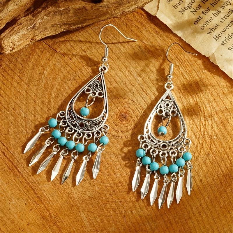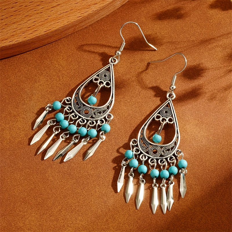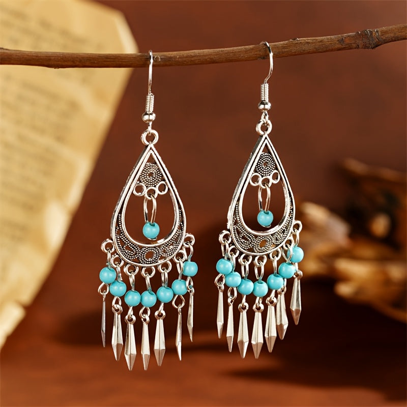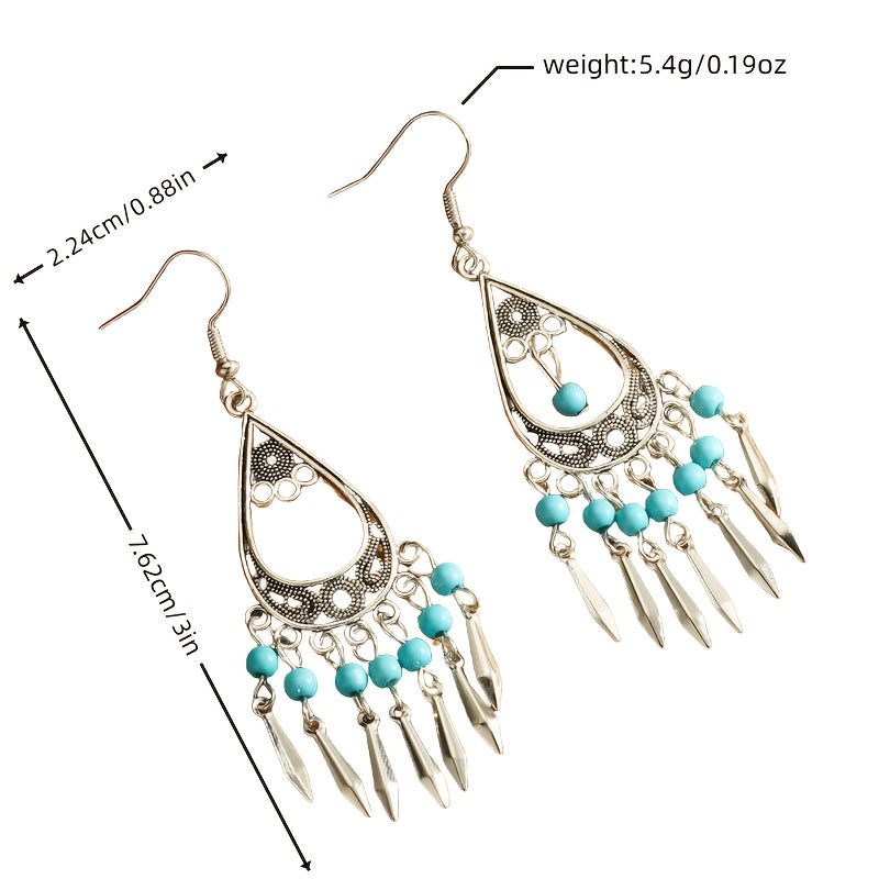 These fashionable tassel drop earrings feature a vintage Bohemian style with turquoise inlay, perfect for versatile everyday wear and vacation outfits. Great for birthdays and holidays.