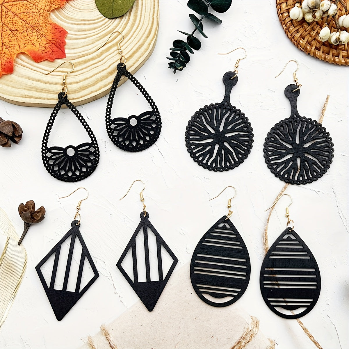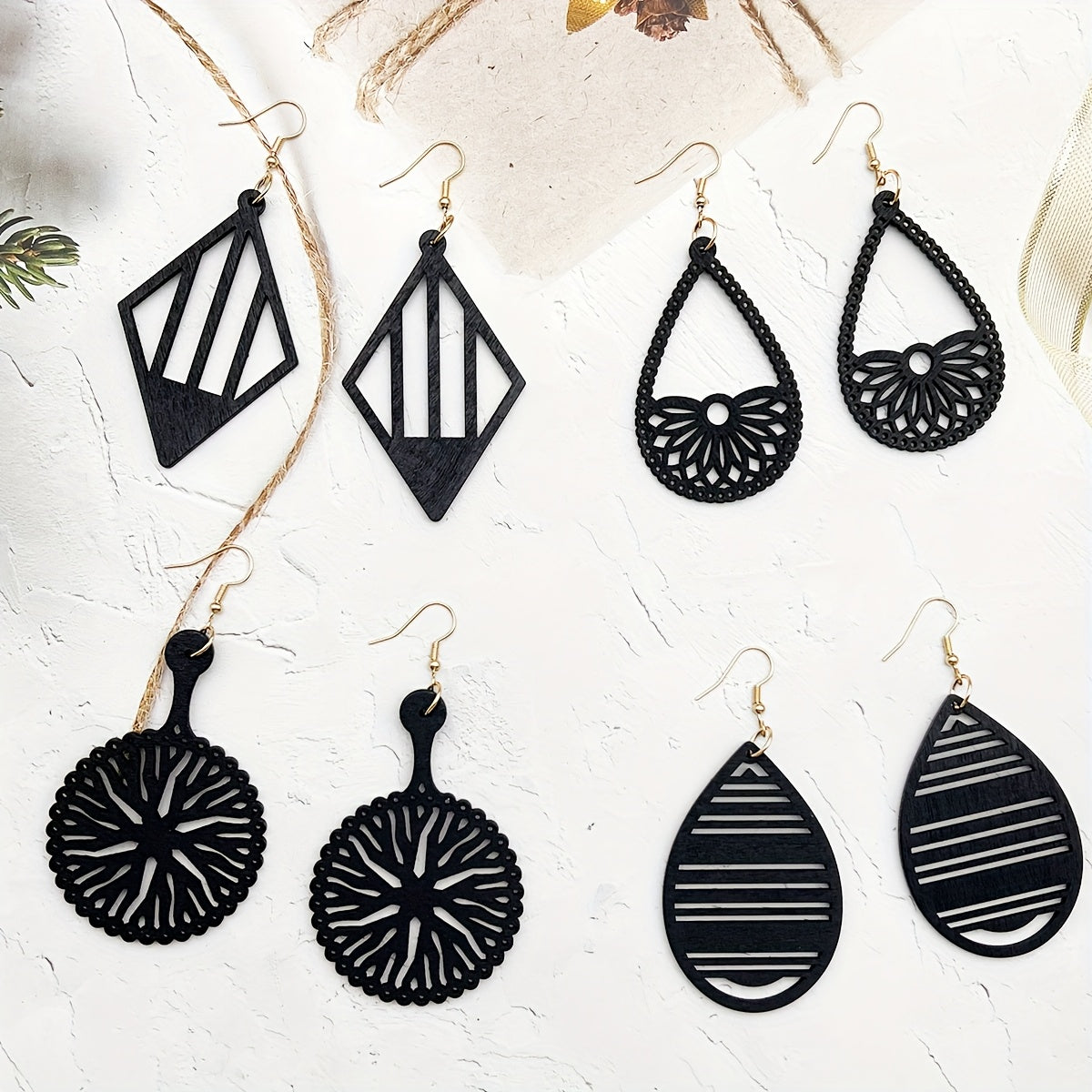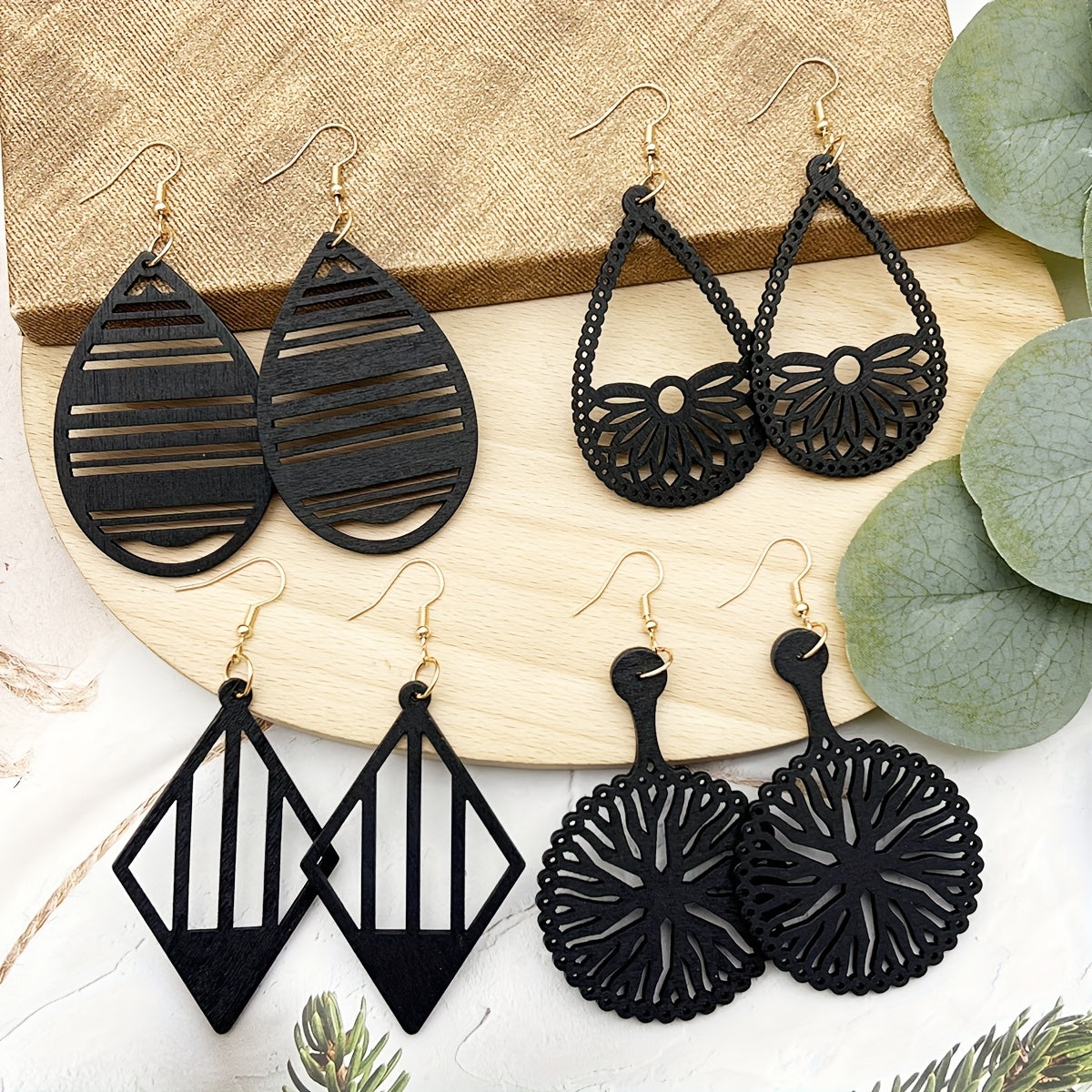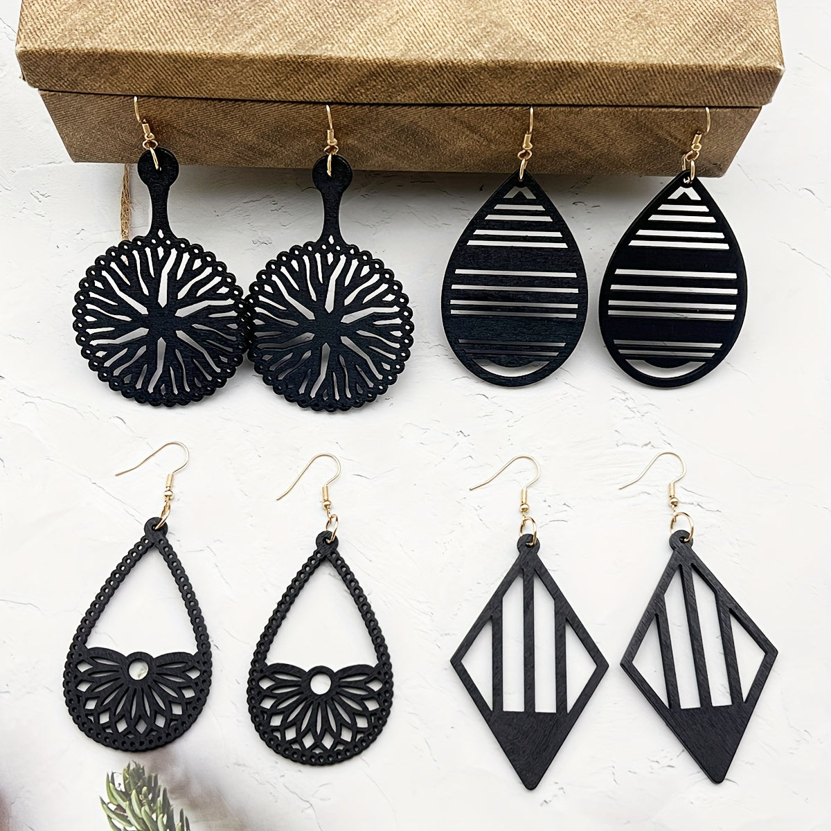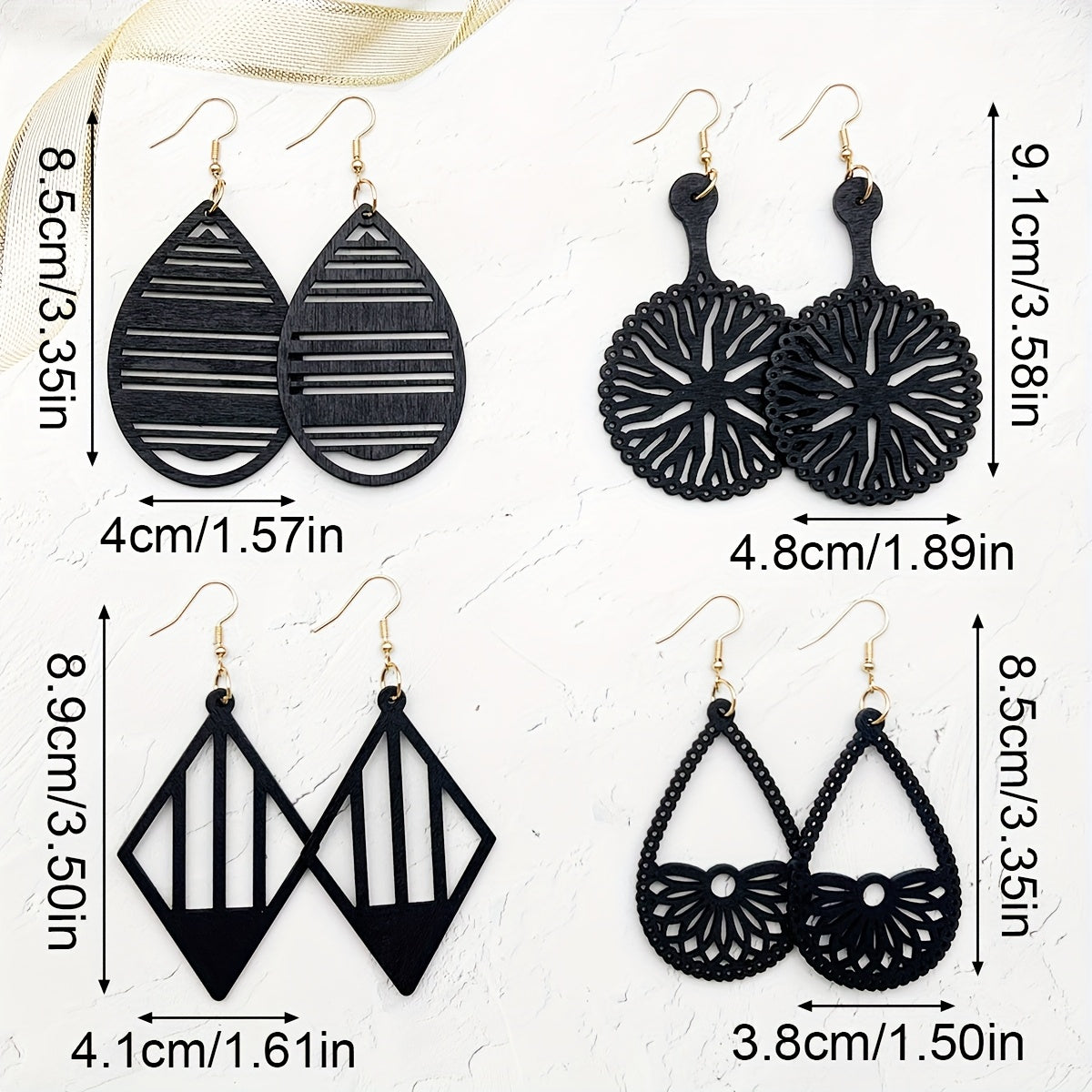 Embrace a holiday vibe with this 4 pairs of bohemian vintage style wooden pendant earrings and creative geometric wooden drop earrings. Perfect for daily wear.