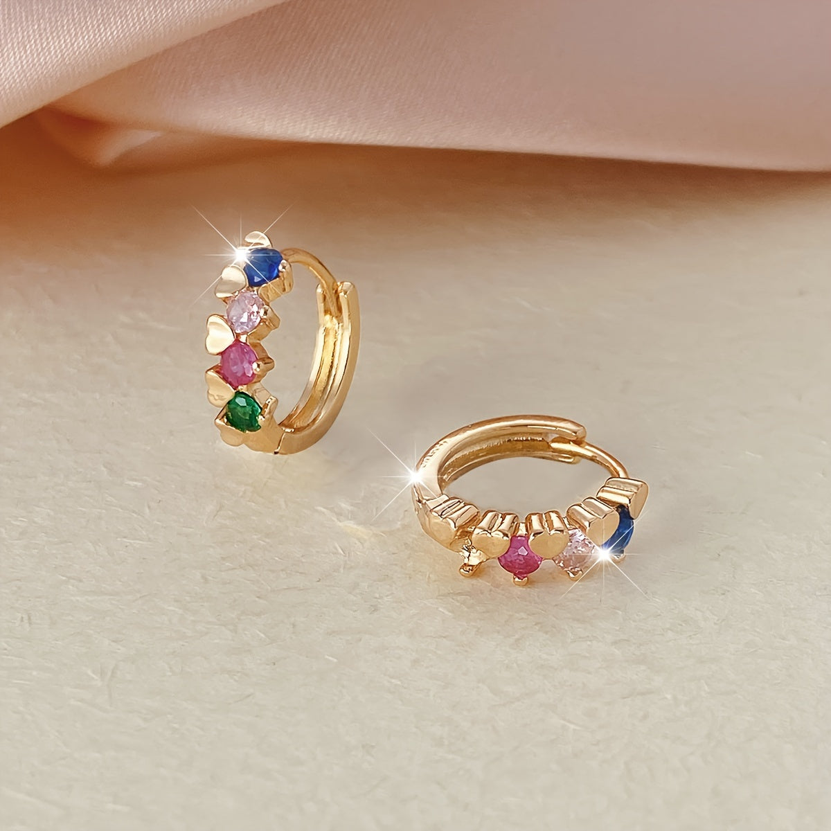 Adorn your ears with these stylish heart-shaped earrings featuring colorful zirconia stones. Perfect for a touch of charm and elegance.