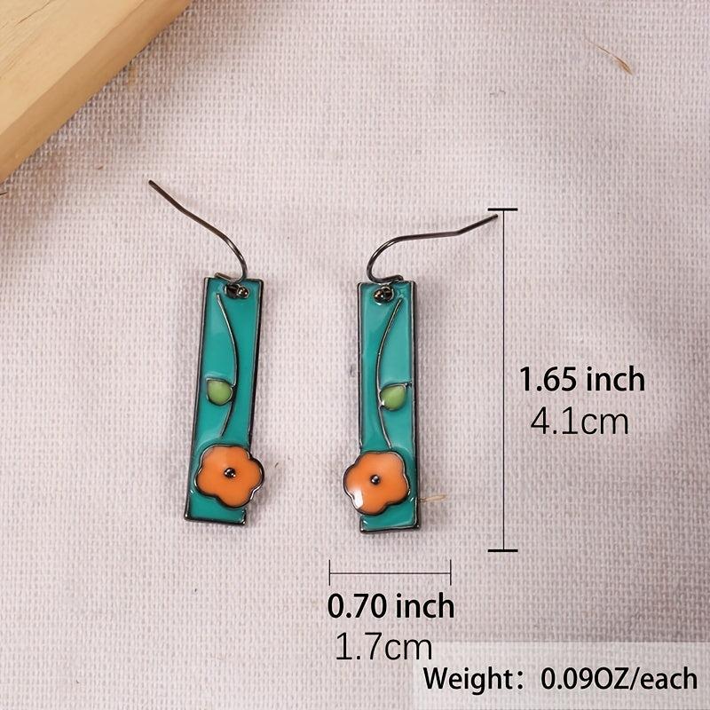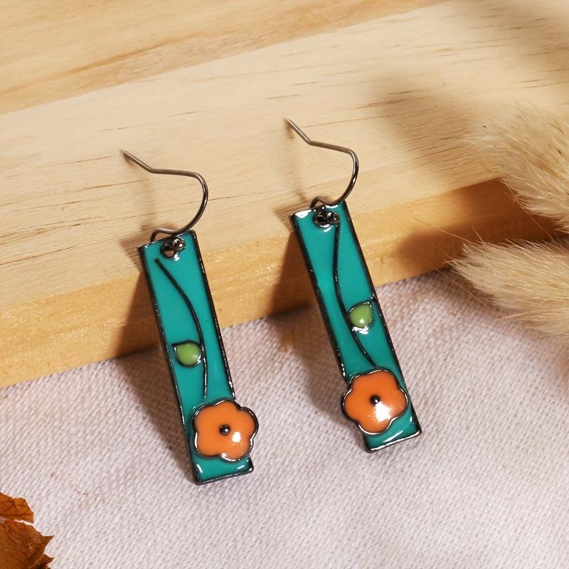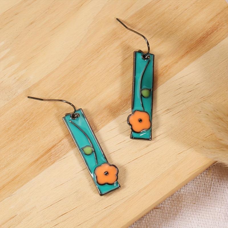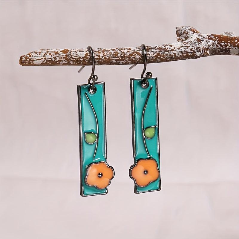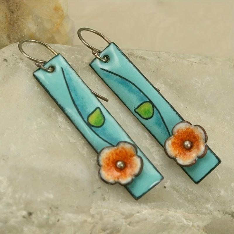 Handcrafted earrings with a whimsical design featuring floral enamel in sky blue and orange colors. These dangle earrings have a gunmetal finish, perfect for an ethnic style look.