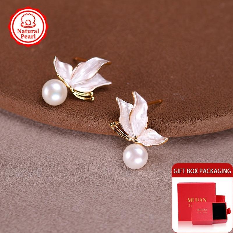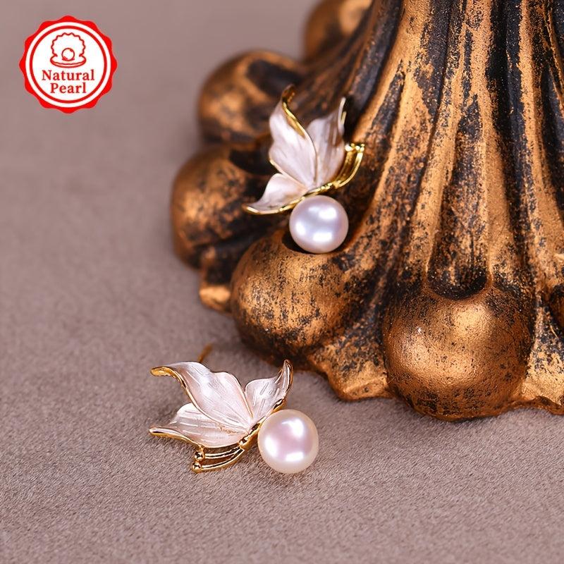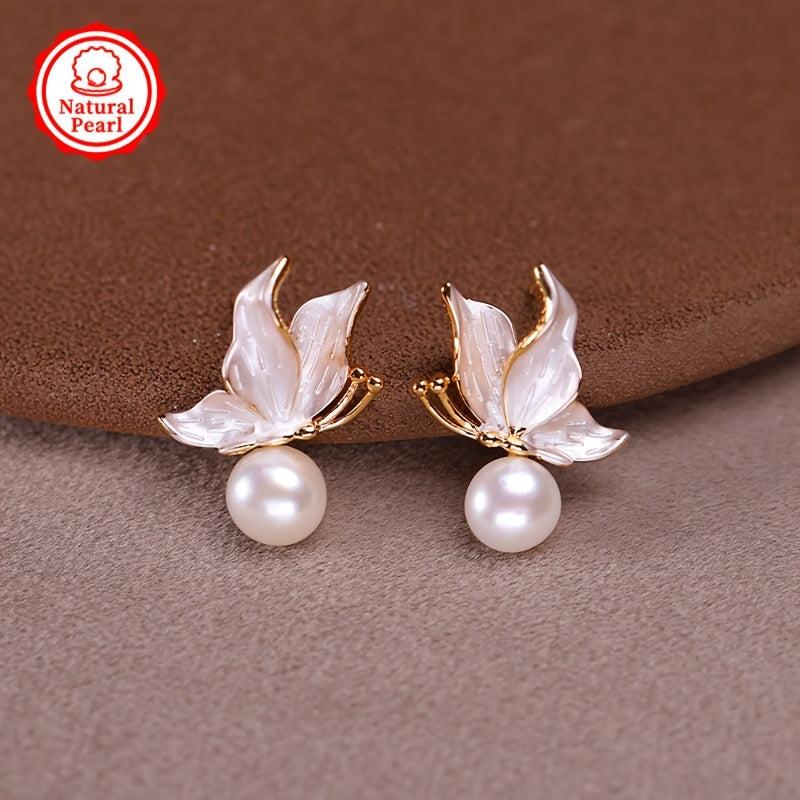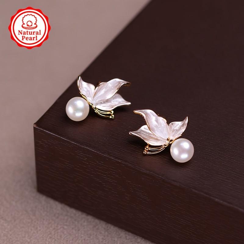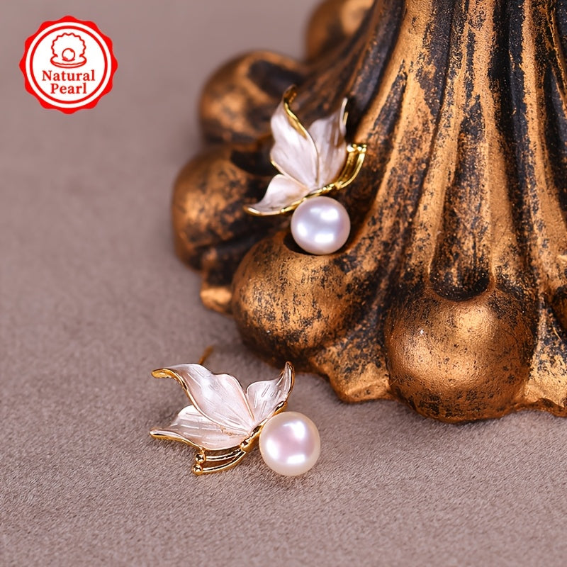 These elegant freshwater pearl stud earrings are vintage-inspired and feature a delicate butterfly design. They are the perfect gift for her and can be worn with casual attire or for special occasions.
