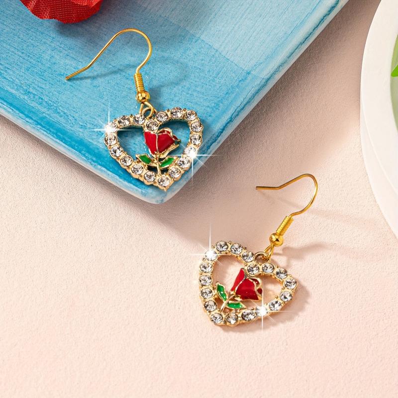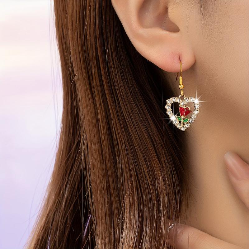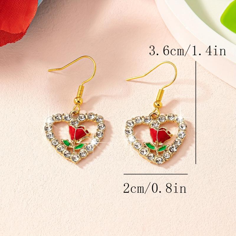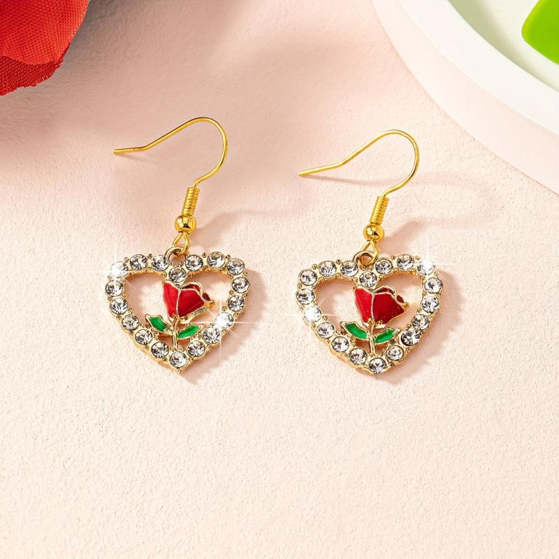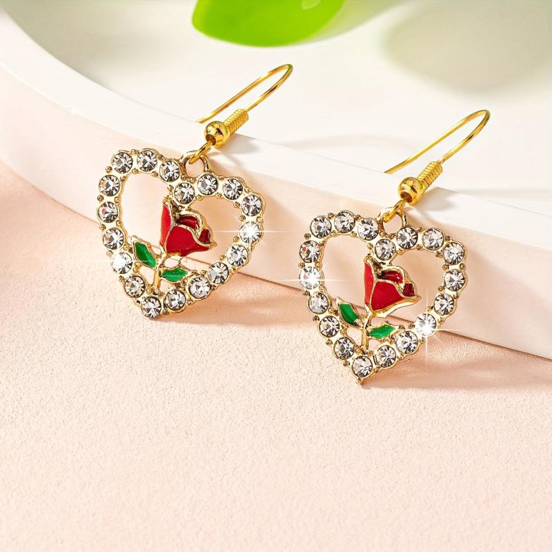 These heart shaped rose drop earrings are made from zinc alloy and feature sparkling rhinestones. The glittering floral design is perfect for daily wear or special occasions.