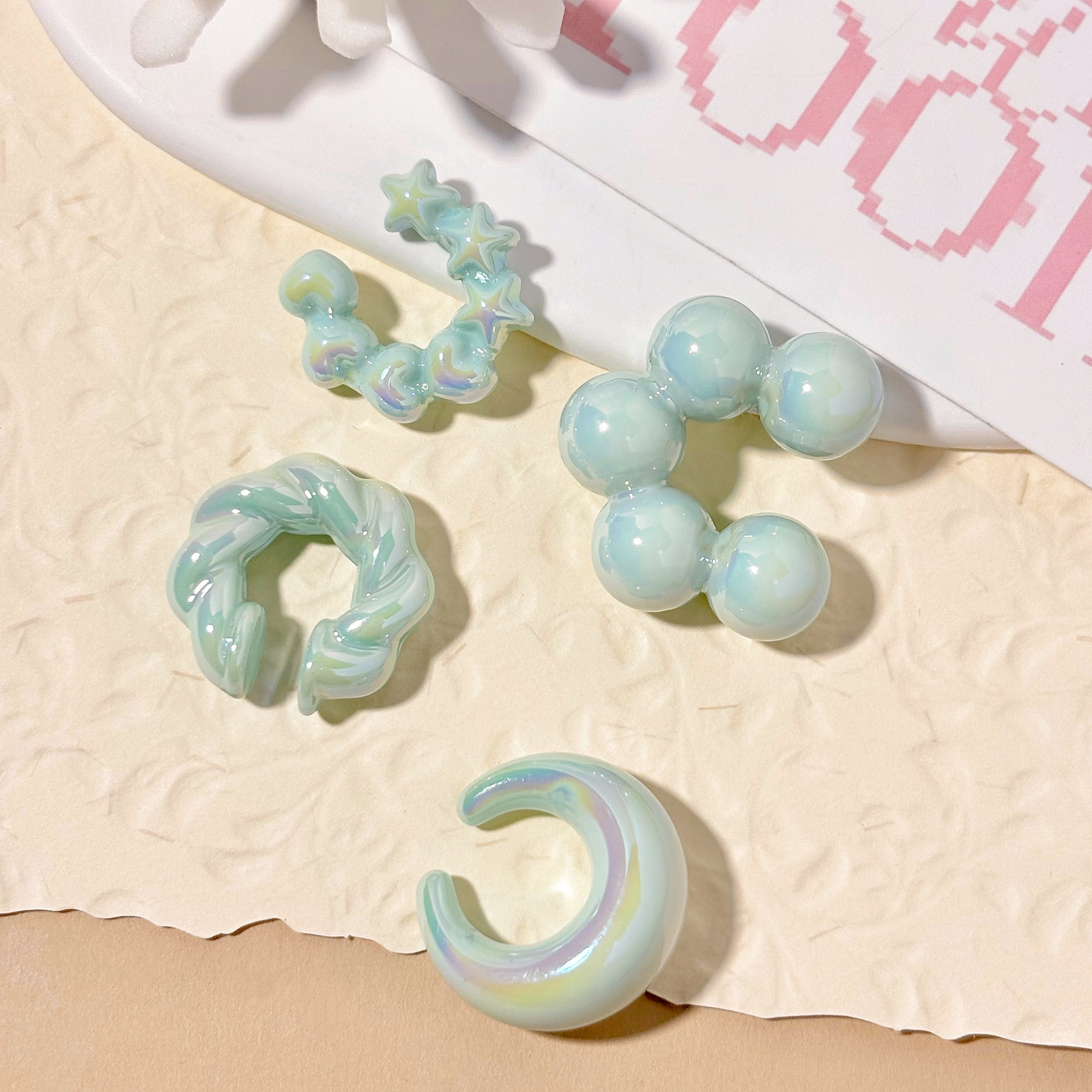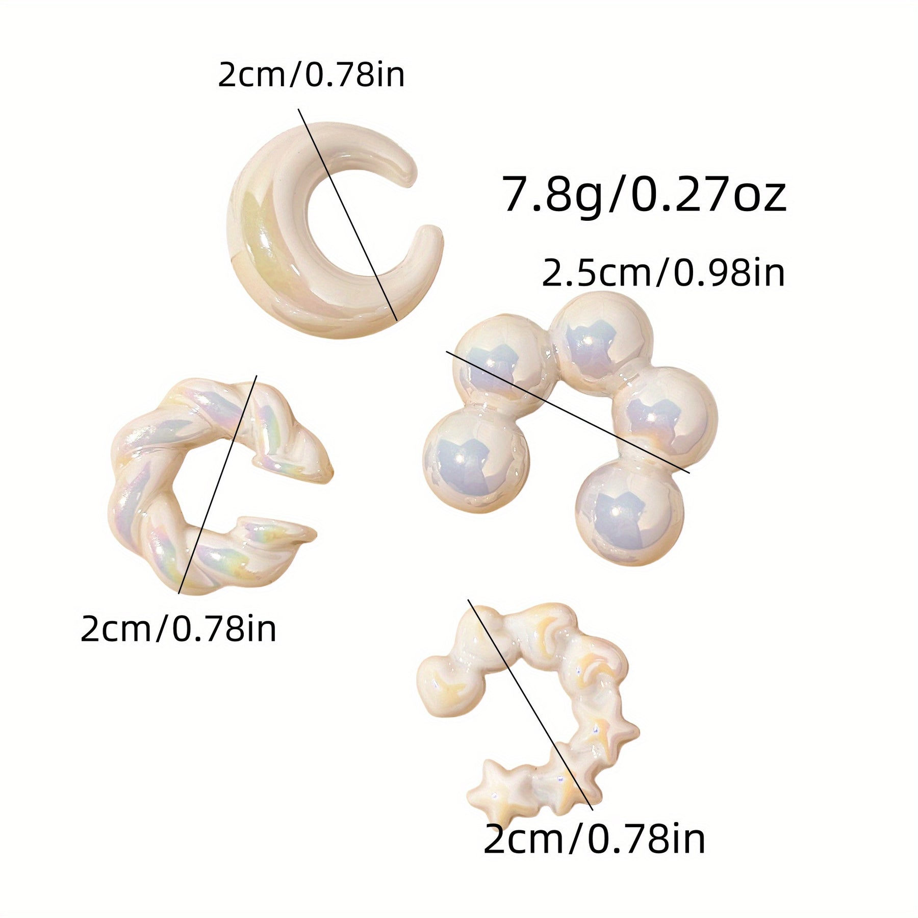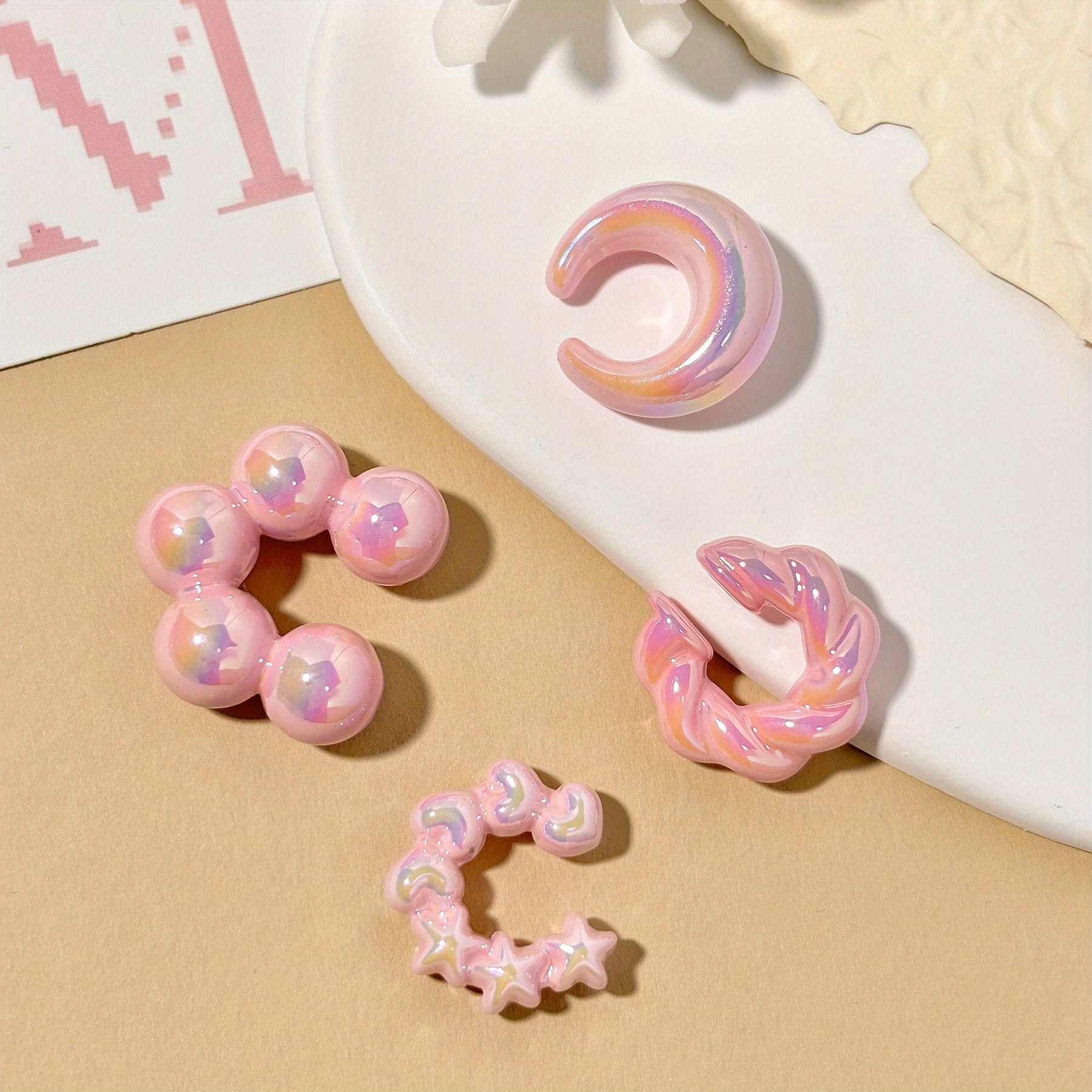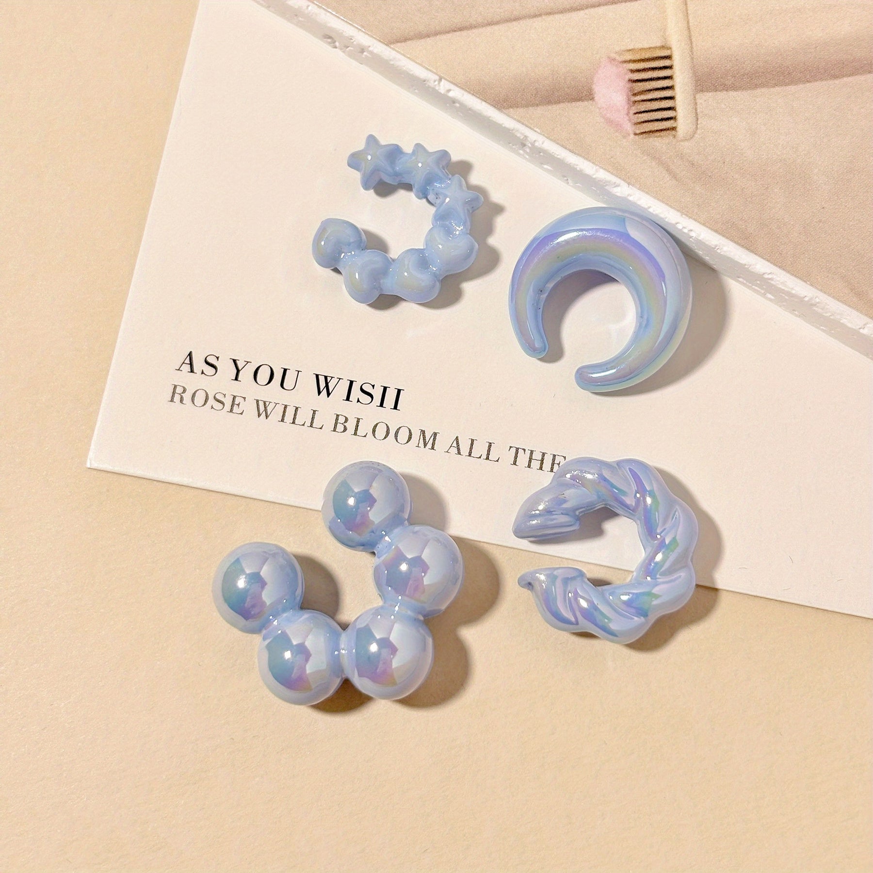 This set of 4 pastel acrylic earrings features crescent moon, star, and heart designs with sparkling beads, perfect for daily wear or parties. No piercing required.
