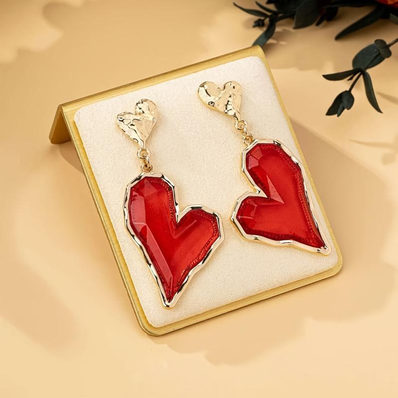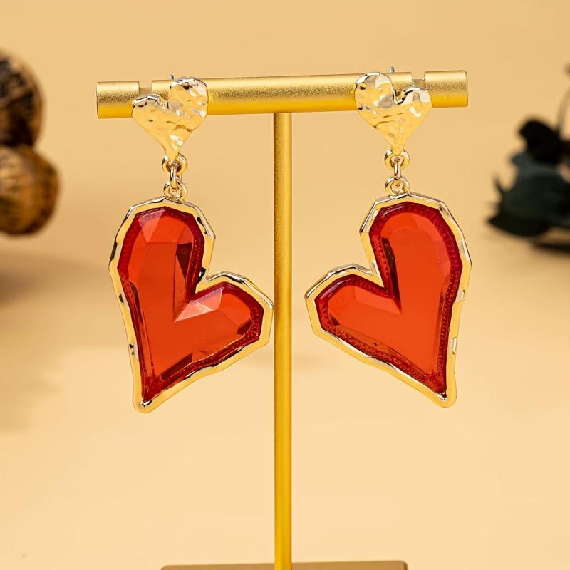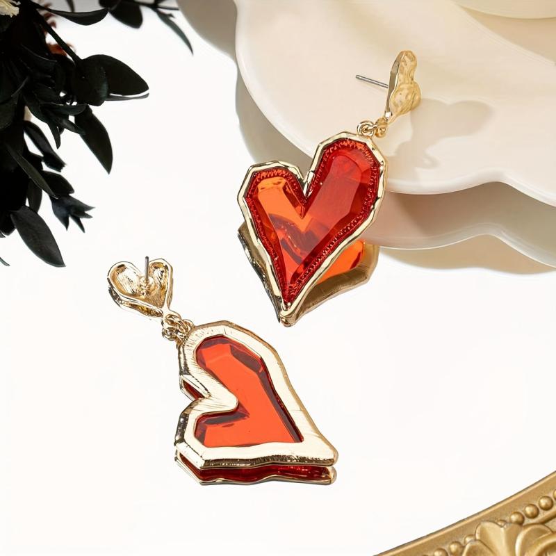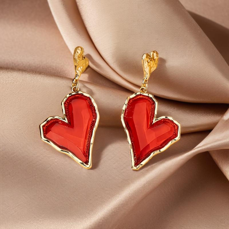 These heart-shaped drop earrings feature red resin with a golden tone zinc alloy. They are perfect for daily wear or parties, making them an ideal gift for mothers. These quirky earrings make a stylish statement.