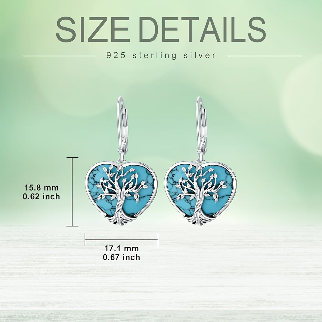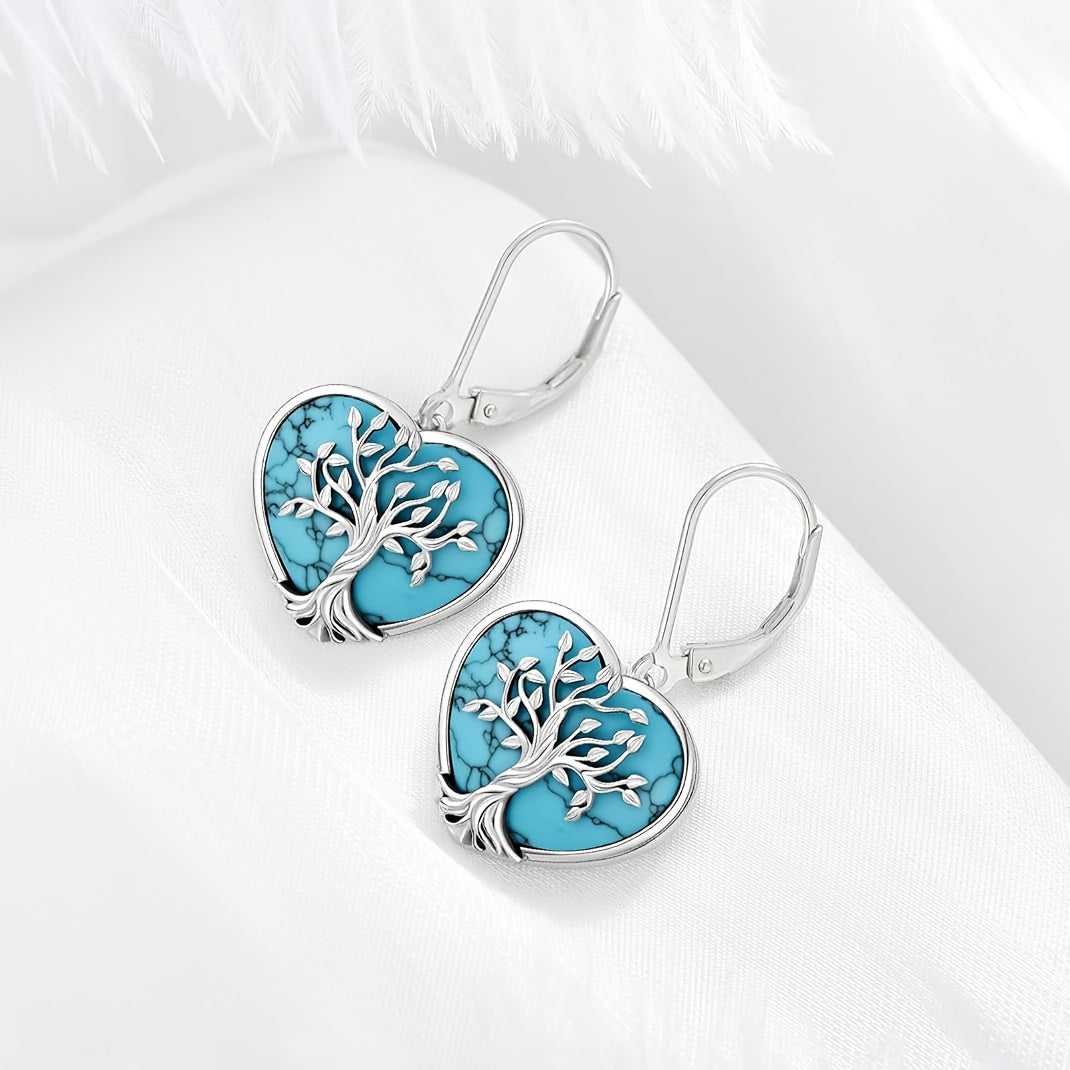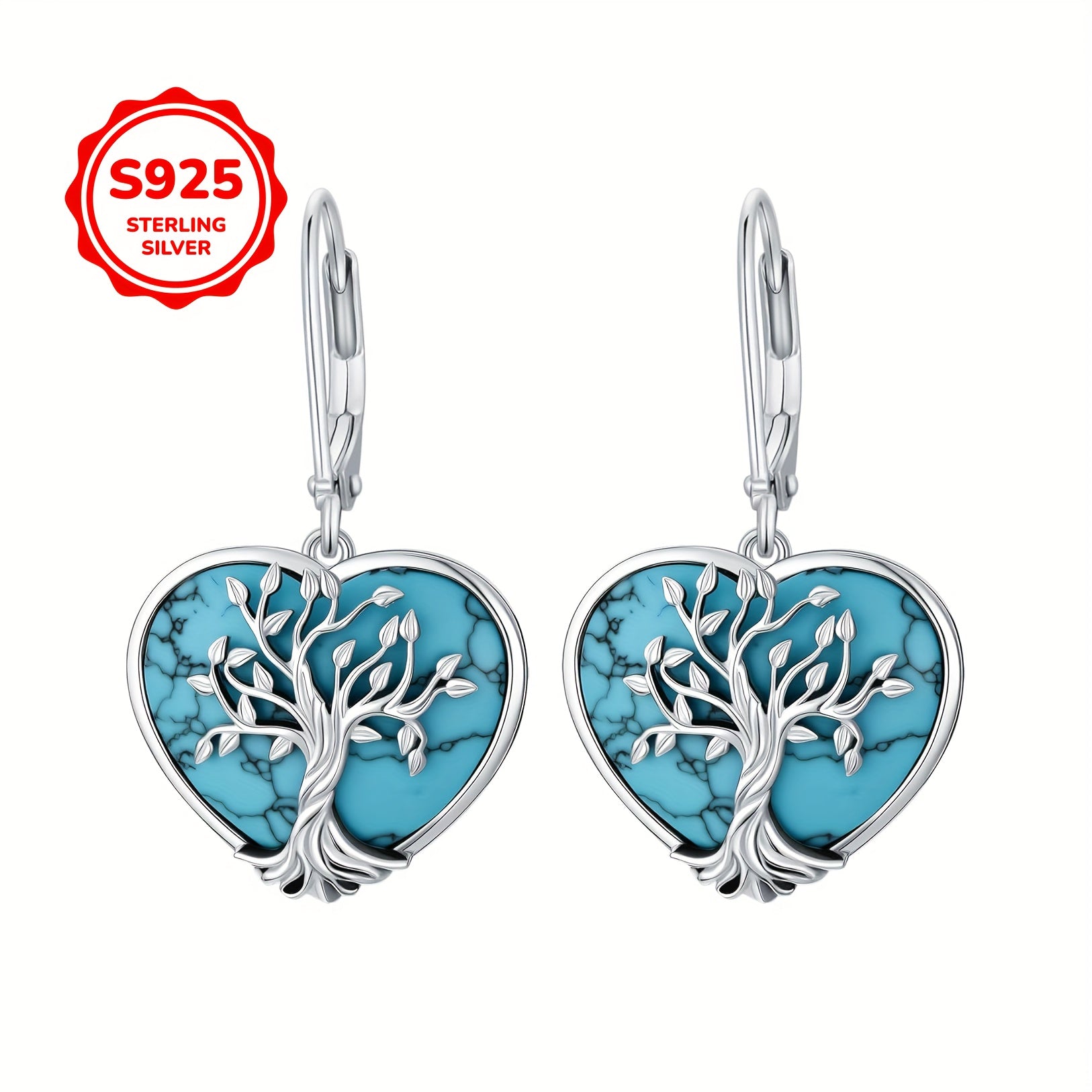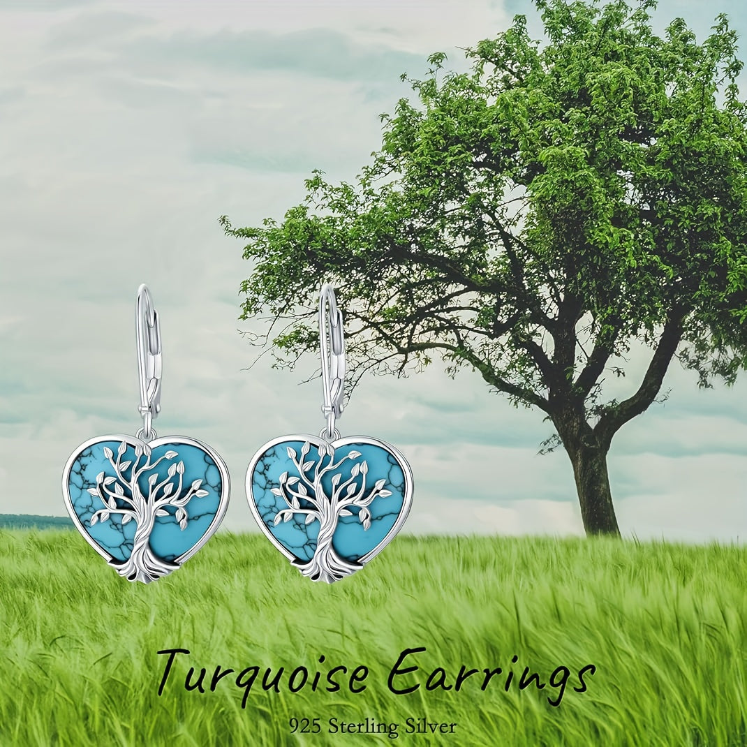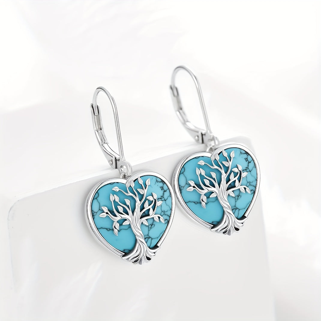 These vintage-style earrings feature a tree of life design with heart-shaped synthetic turquoise inlay. Made of S925 silver, they are perfect for casual attire and gifting.