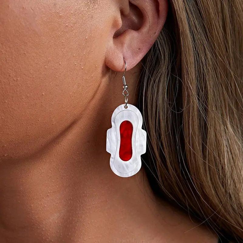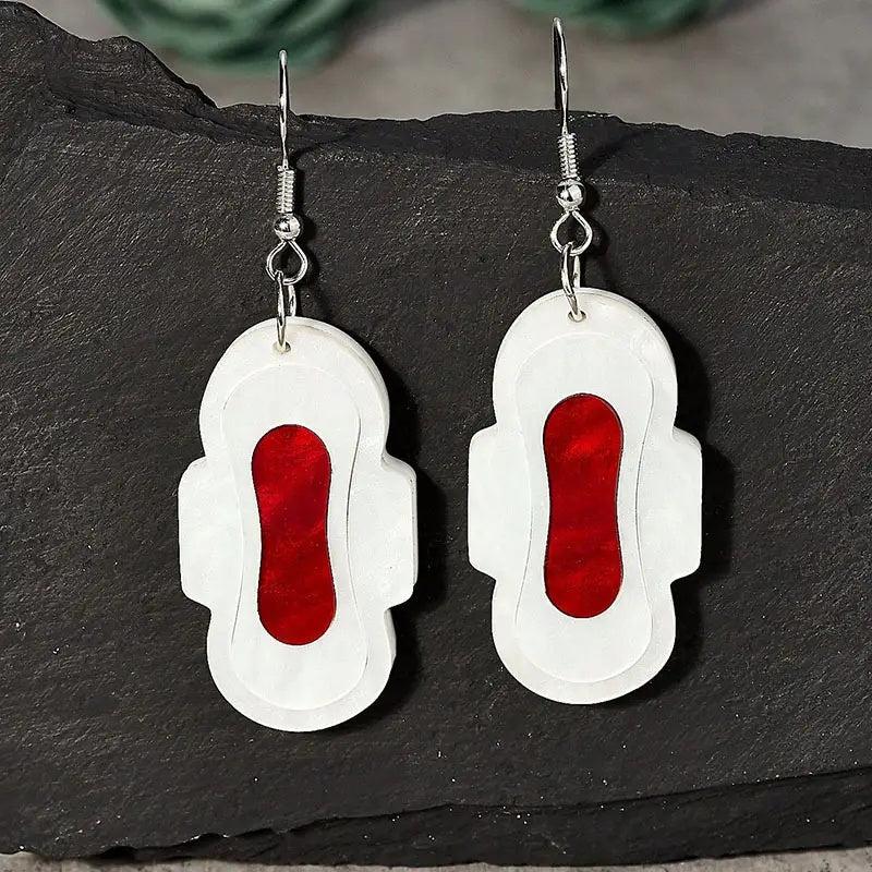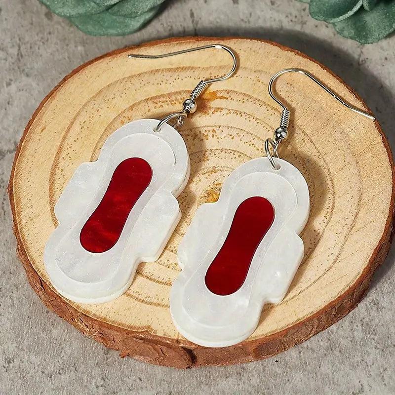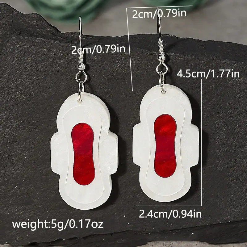 These unique acrylic earrings are designed in the shape of sanitary napkins, making a bold and playful statement. They are lightweight and comfortable to wear, perfect for daily wear or for adding a fun touch to your party outfits. The earrings feature copper hooks and have no plating, ensuring durability and a long-lasting shine.