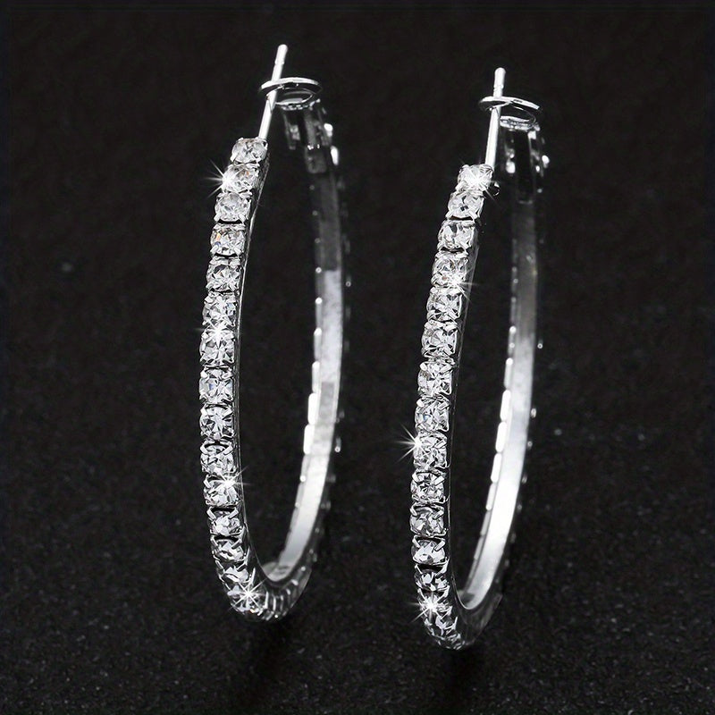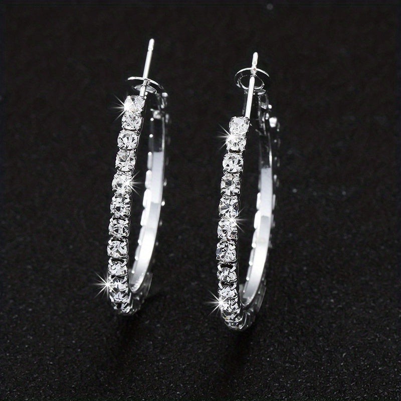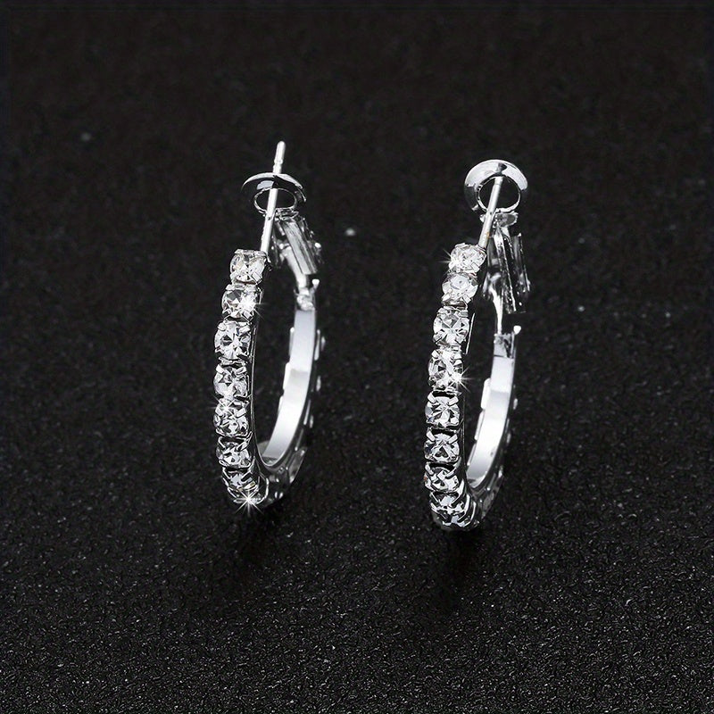 These beautiful silvery hoop earrings feature a full rhinestone decor, adding a touch of elegance to your outfit. Perfect for daily wear and special occasions.