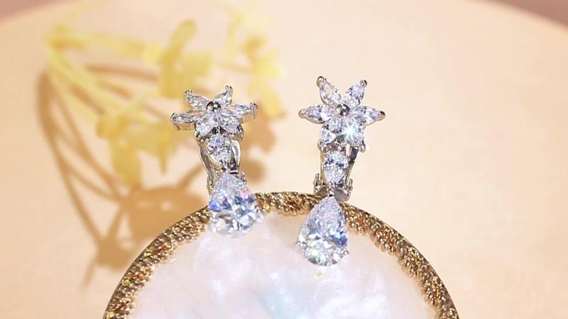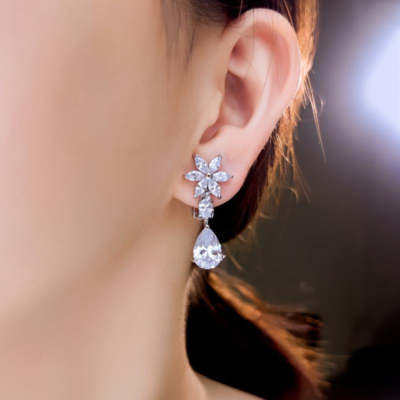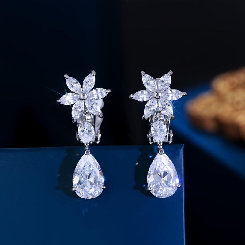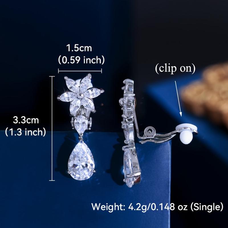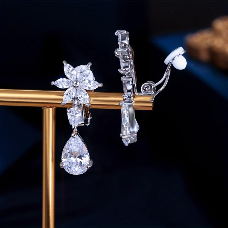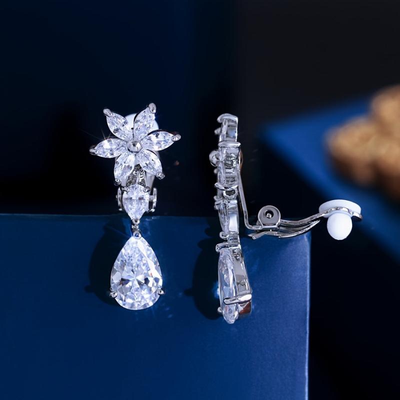Elegant silvery plated clip-on earrings featuring sparkling water drop and flower design with cubic zirconia. Perfect for weddings, parties, anniversaries, and more.