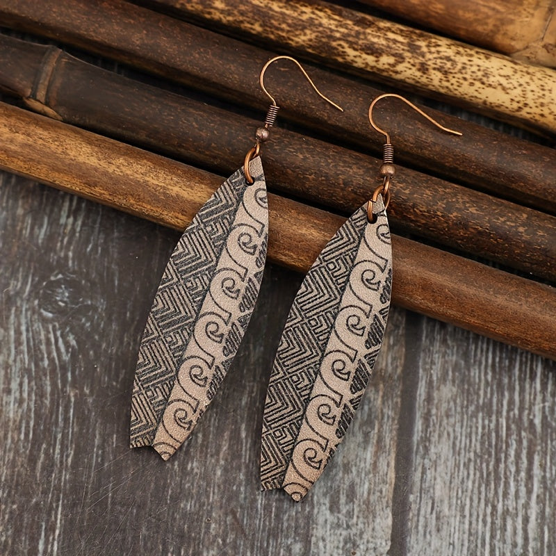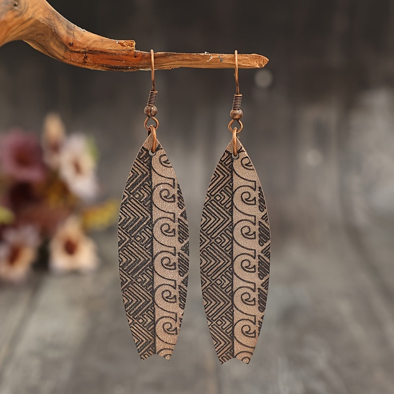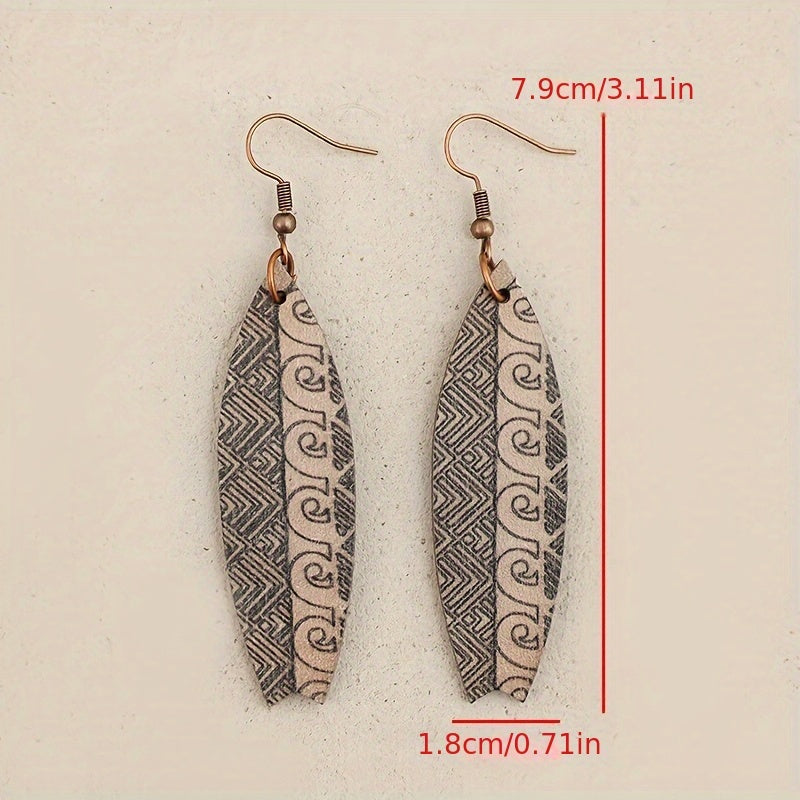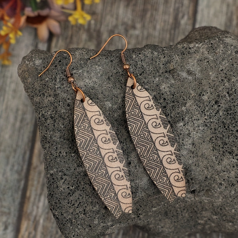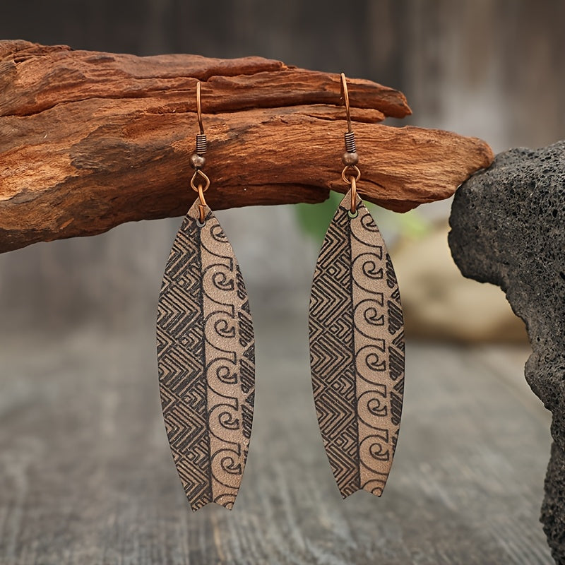 These stylish wooden earrings feature a geometric wave print design for a unique look. Made from recycled wood, they are perfect for everyday casual wear or formal occasions in their retro brown color.