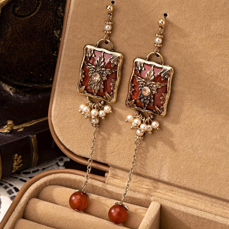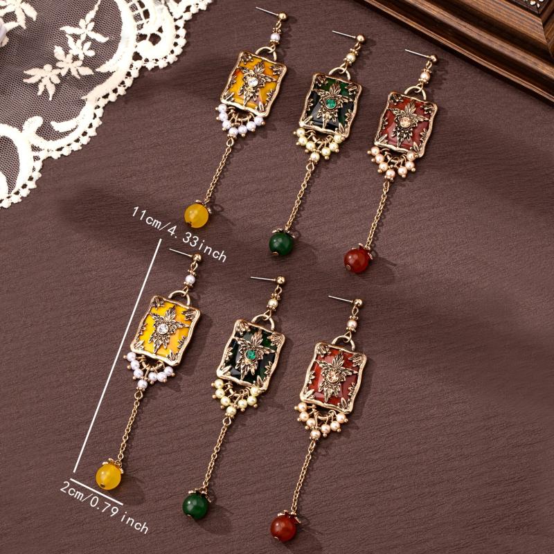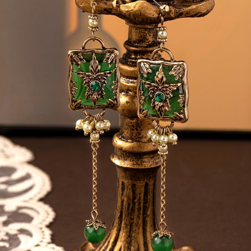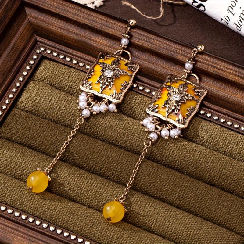 Elegant vintage boho style earrings featuring geometric design, faux pearl tassel dangles, and rhinestone embellishments.
