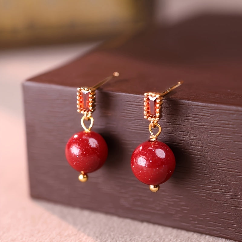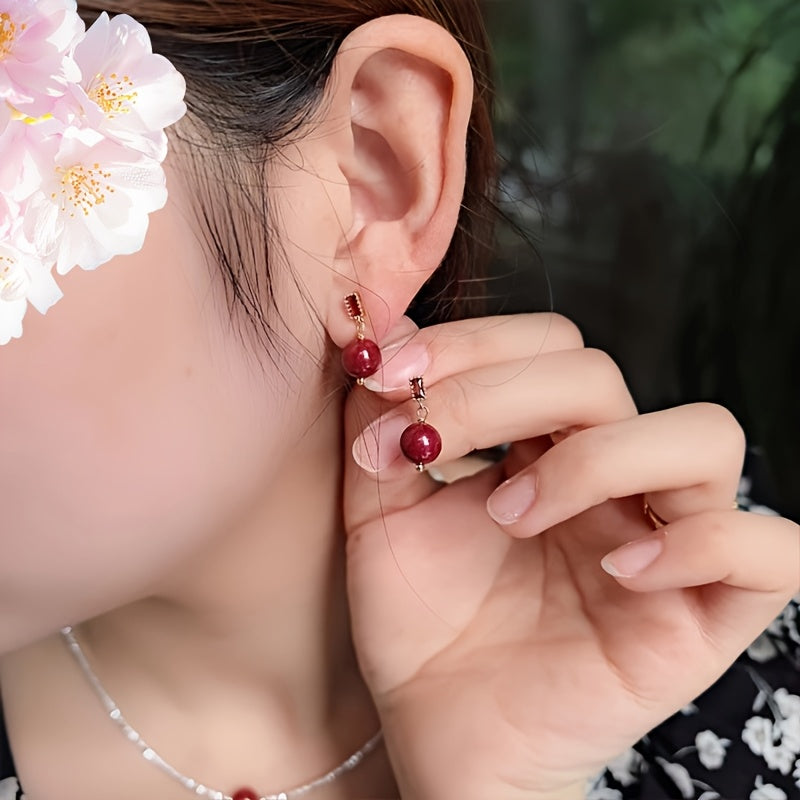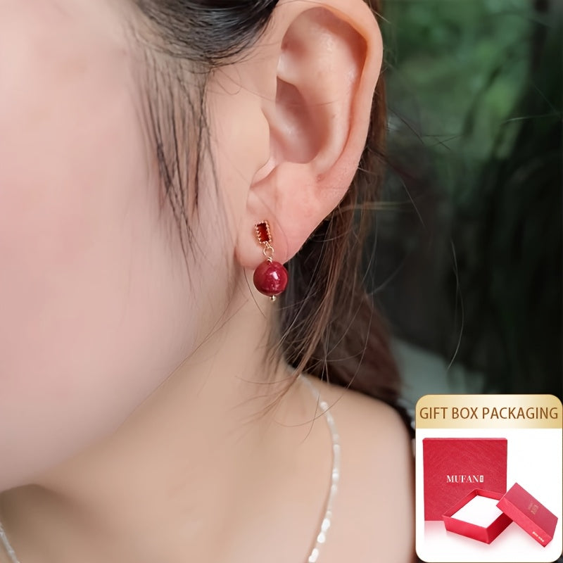Vintage Cinnabar Stone Drop Earrings Silver Needle Dangle Jewelry