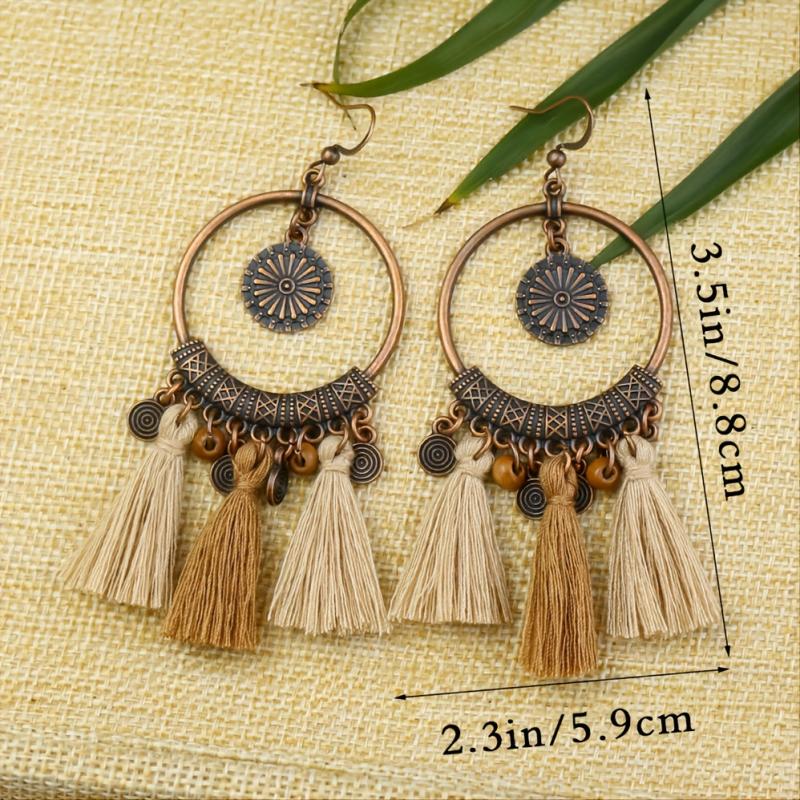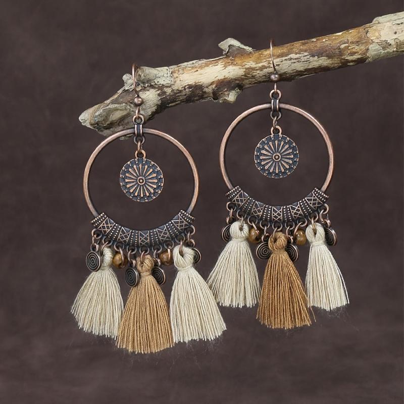 Add a touch of retro charm to your outfit with these vintage copper ring earrings featuring a polka dot design and two-tone tassels.