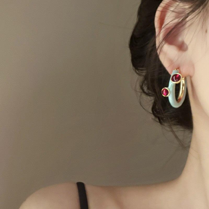 These elegant earrings feature red crystal accents in a geometric design, perfect for adding a touch of vintage French style to your look. The earrings are made with KC gold-plated alloy and come with copper posts for durability.