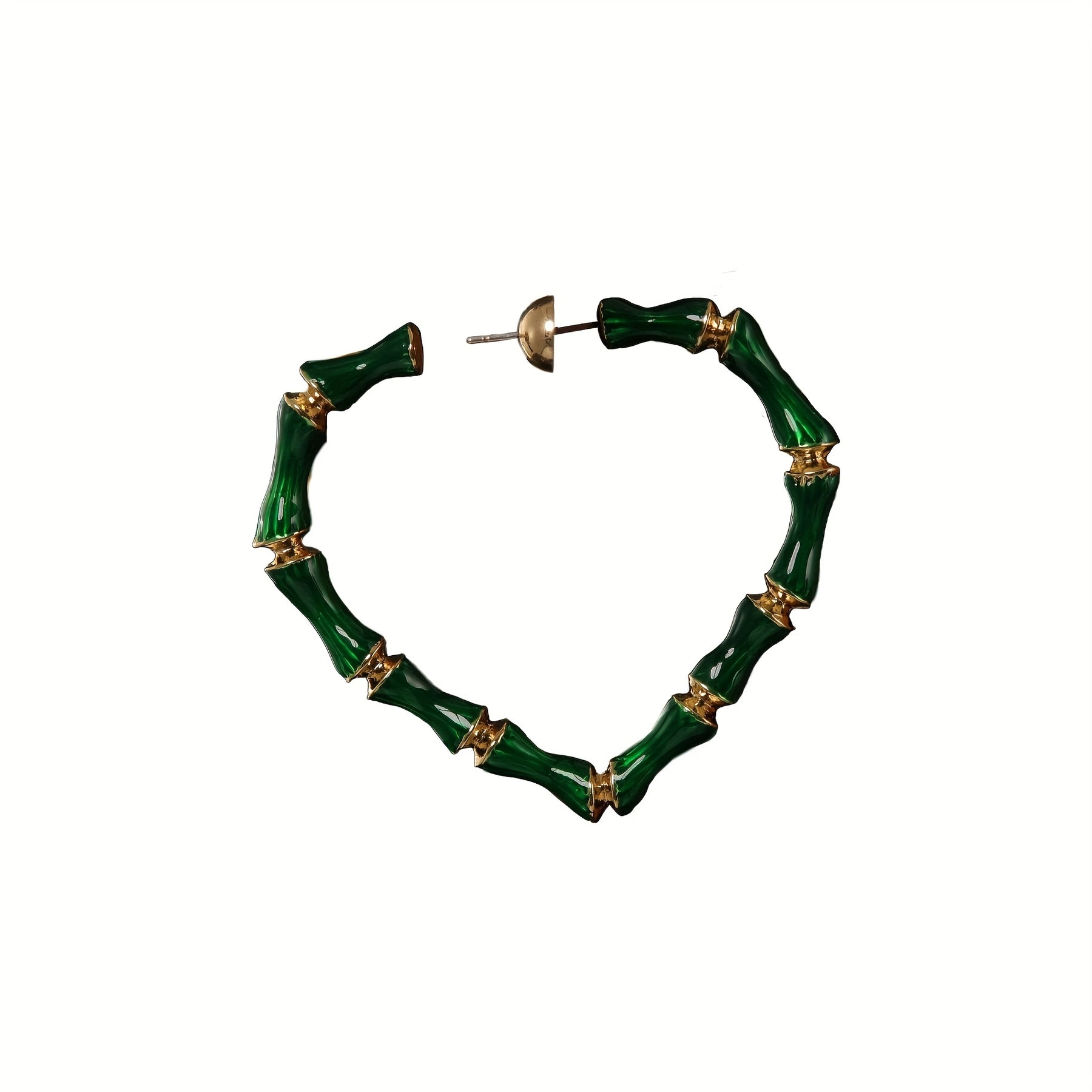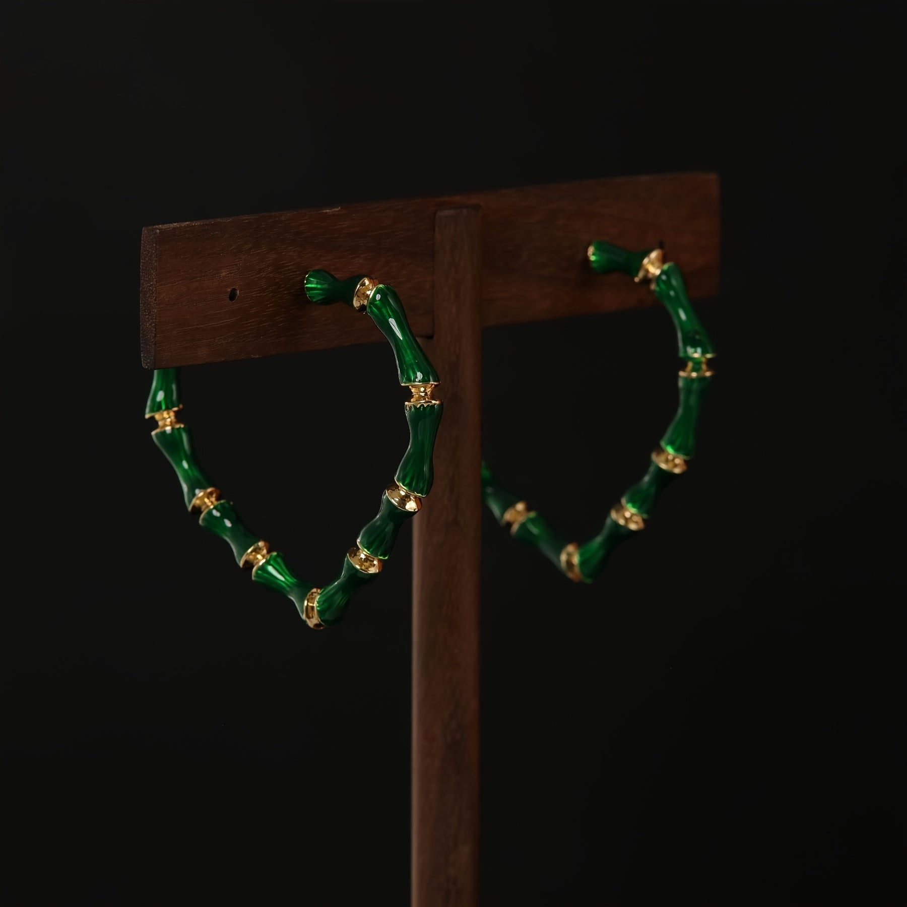 Vintage Green Enamel Bamboo Heart Earrings 22K Gold Accents Retro Chinese Style