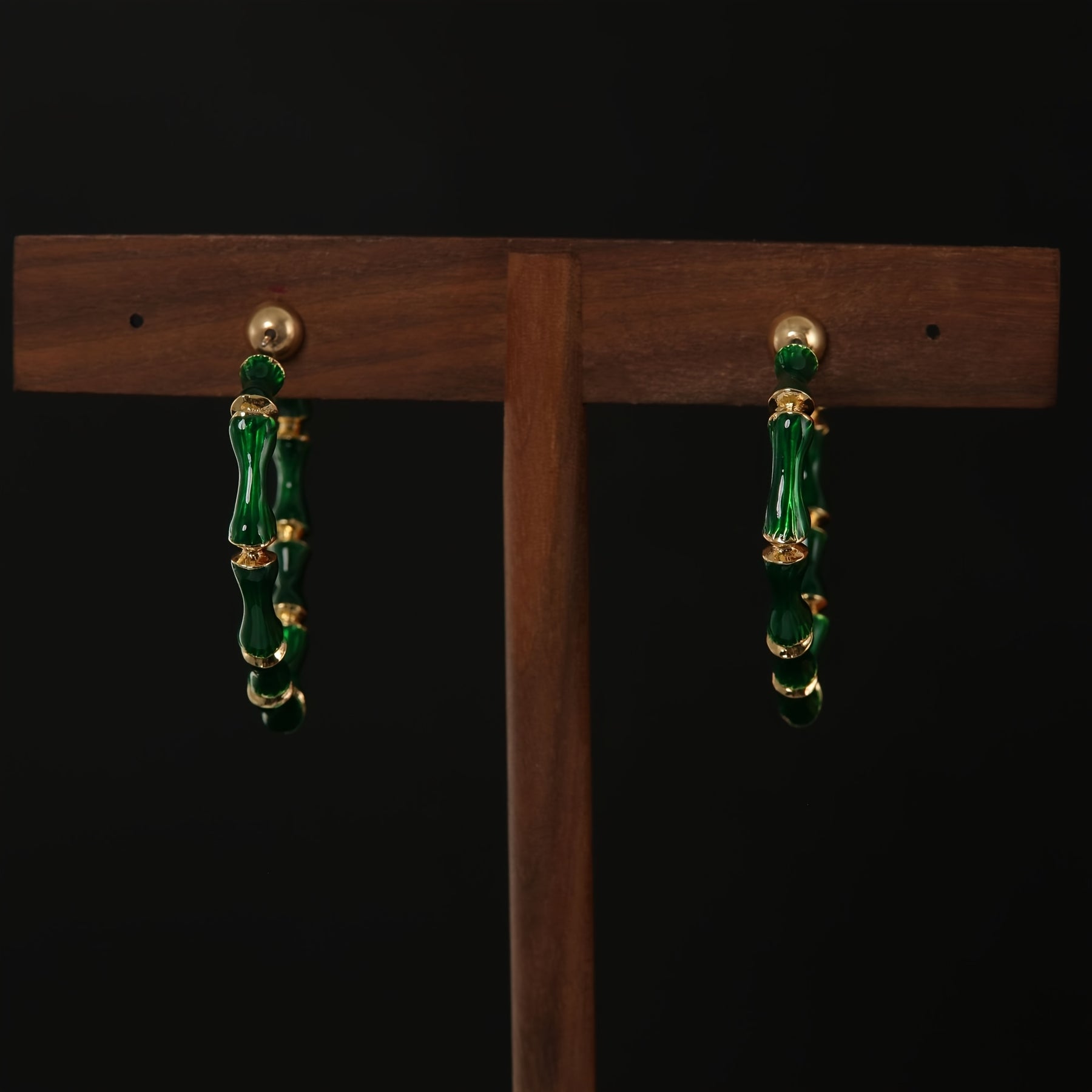 These unique earrings feature a pair of green enamel bamboo joint hearts with 22K plated golden accents, inspired by traditional Chinese design. Versatile for daily wear.