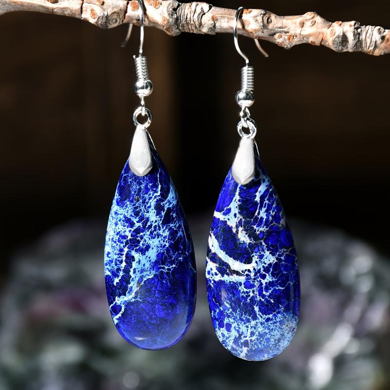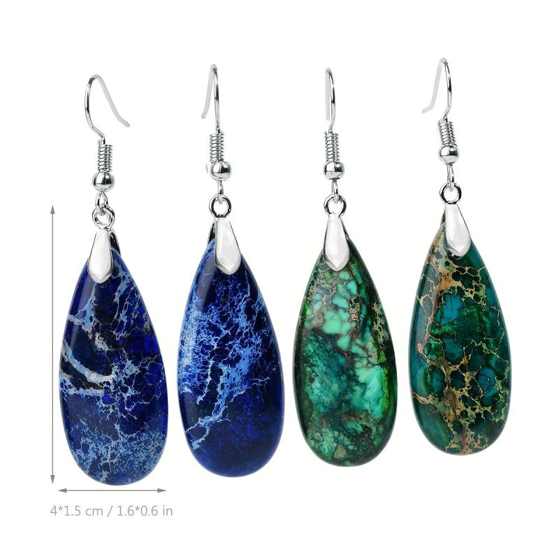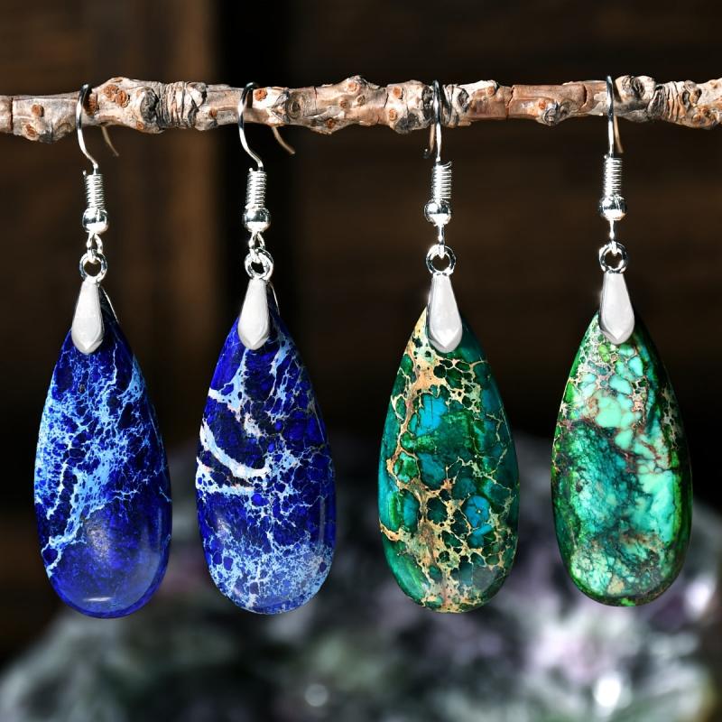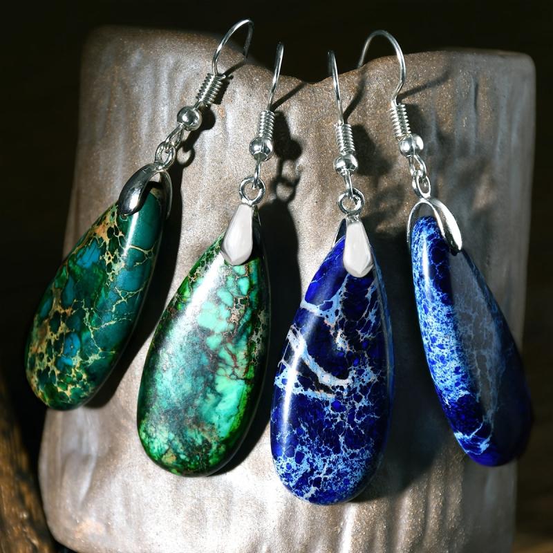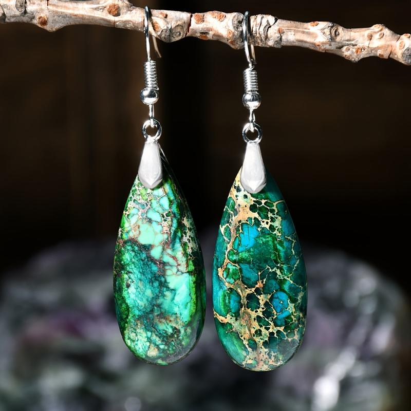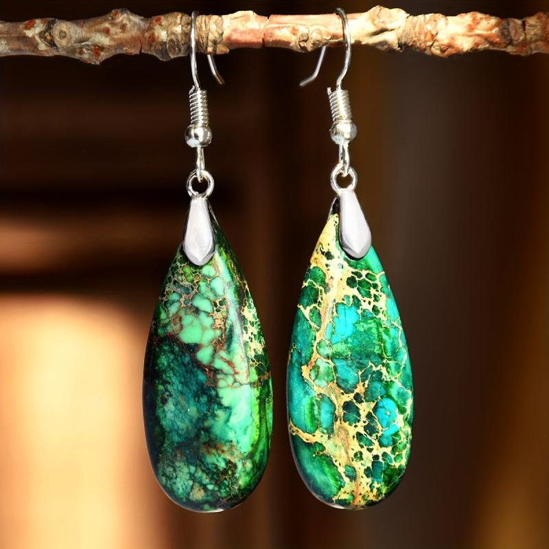 These vintage green droplet stone earrings feature a natural gradient design, perfect for a bohemian holiday look. Each earring is uniquely crafted with a retro charm.