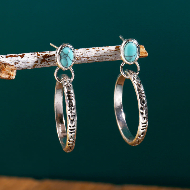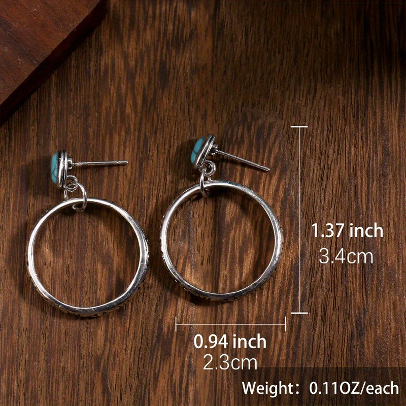 Antique silvery hollow circle drop earrings with green stone for a bohemian touch. Perfect accessory for women.
