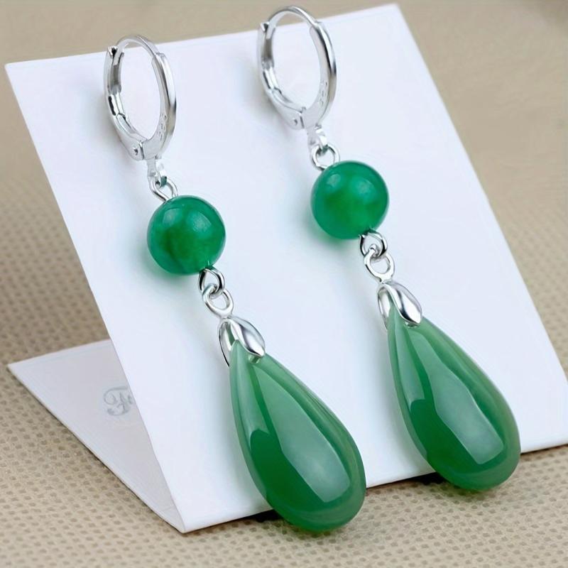 Vintage Green Teardrop Dangle Earrings - 925 Sterling