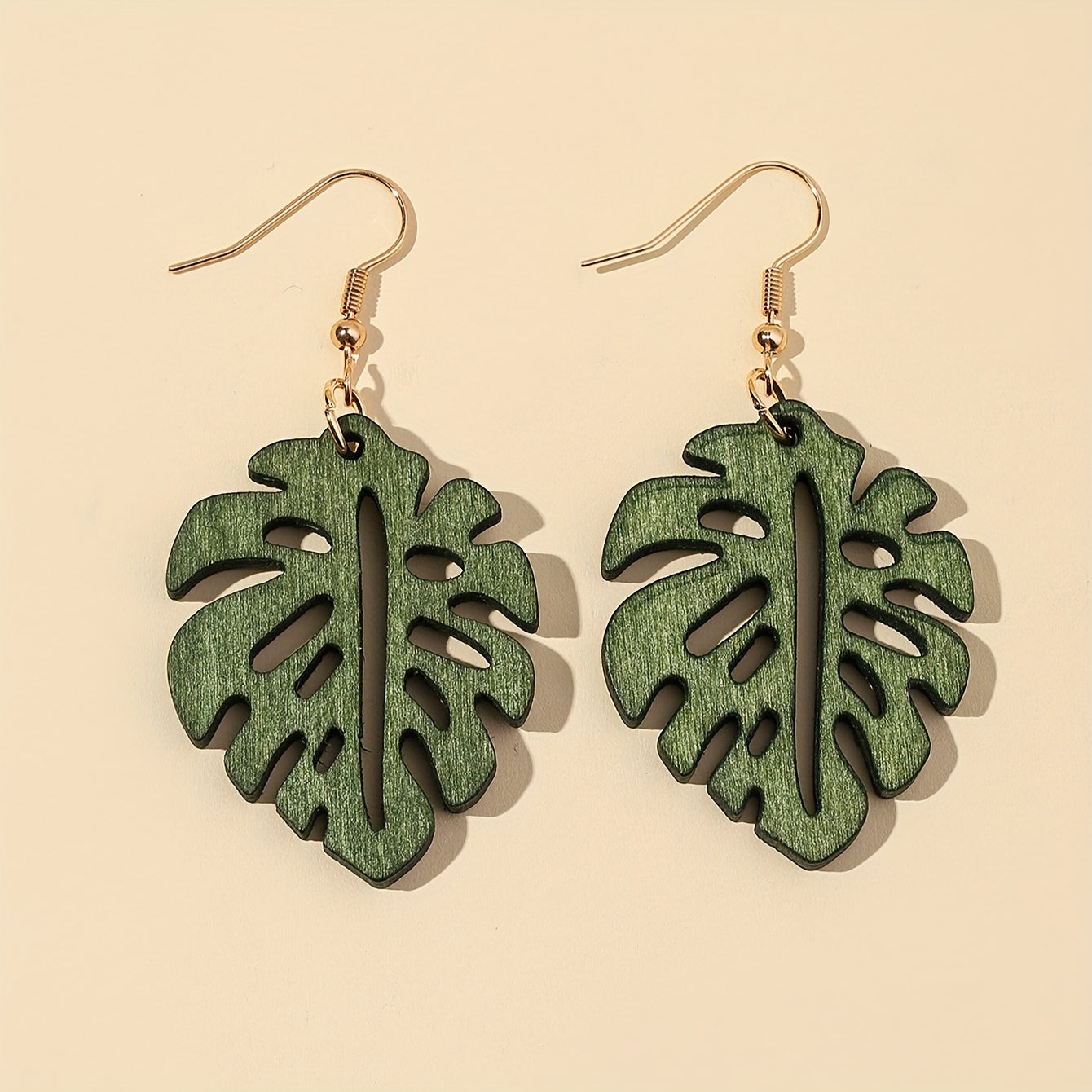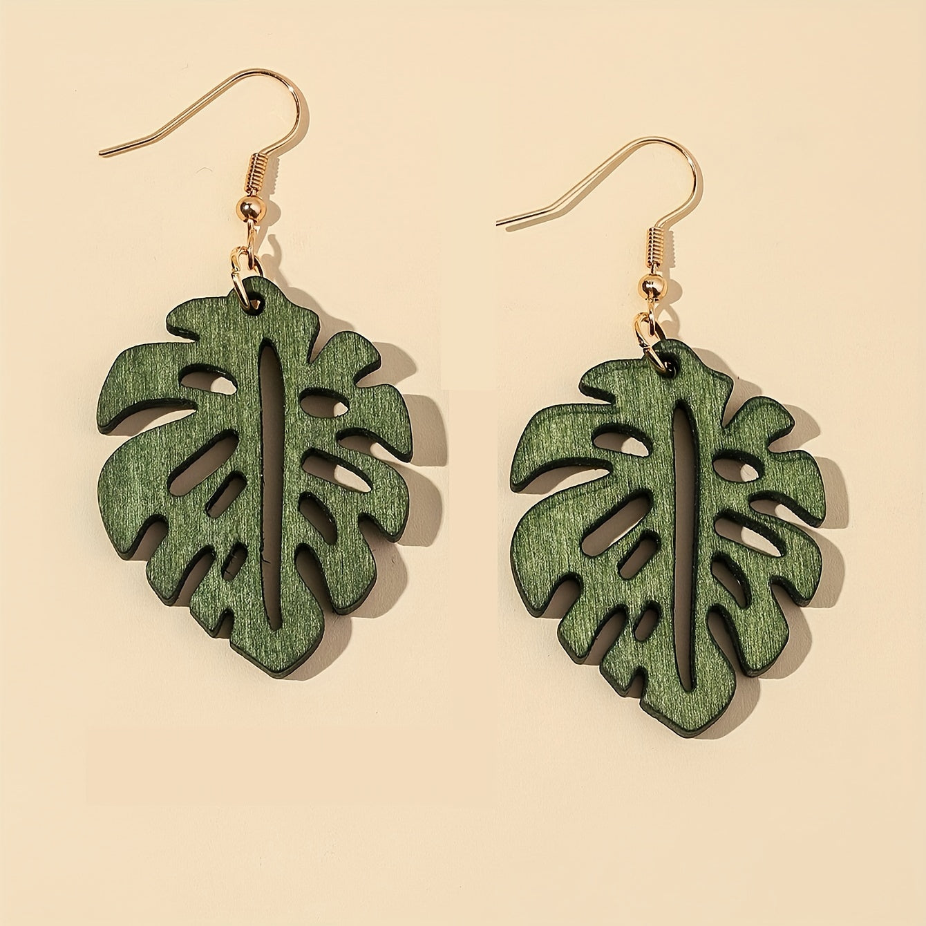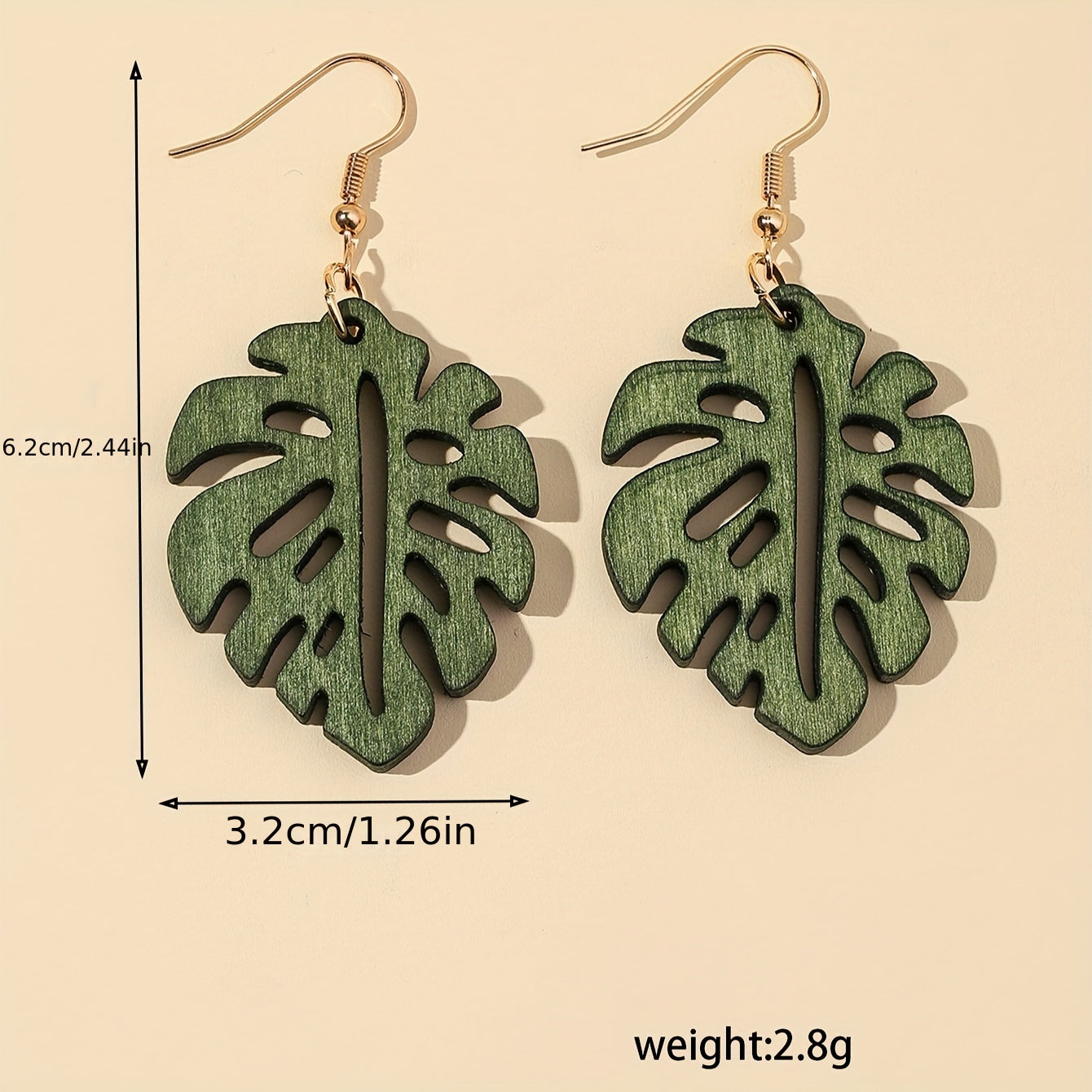 These green wooden leaf dangle earrings exude a vintage and sexy style. The golden tone zinc alloy hooks complement casual attire perfectly.