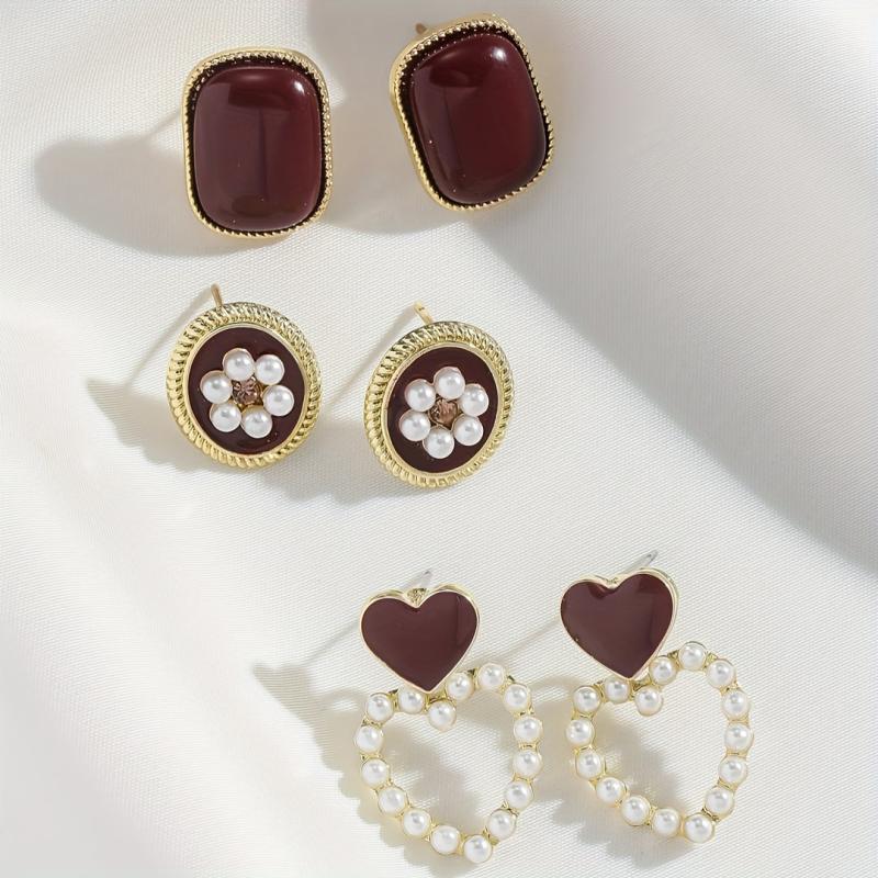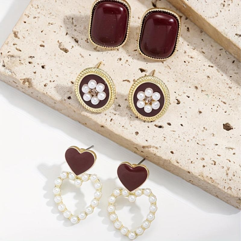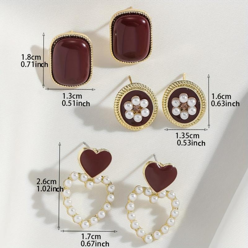 This set includes three stylish women's earrings inspired by Hong Kong fashion. The faux pearl heart-shaped studs are perfect for daily wear and gatherings.