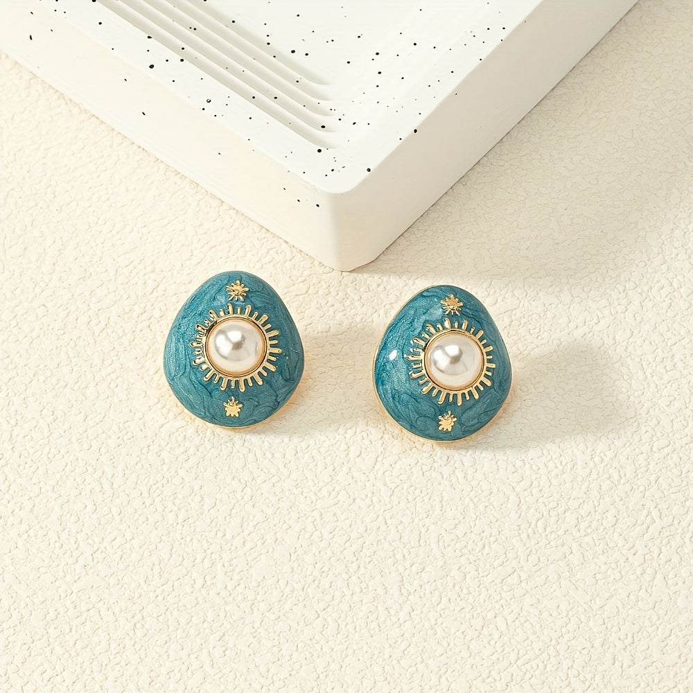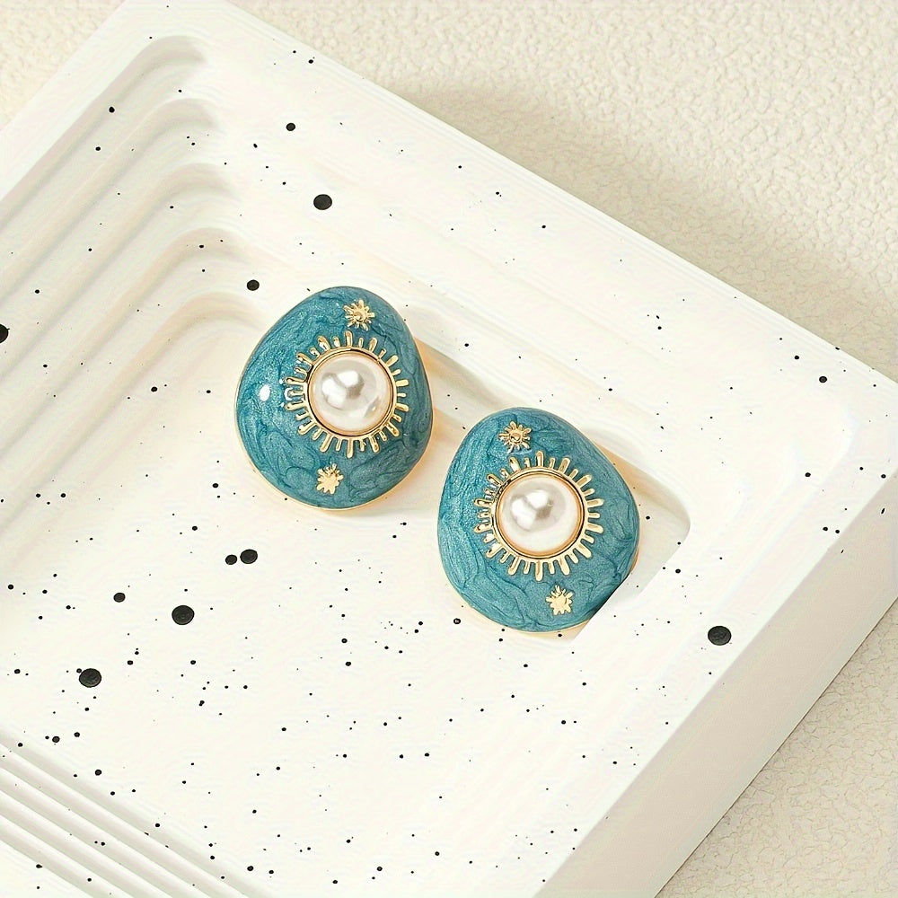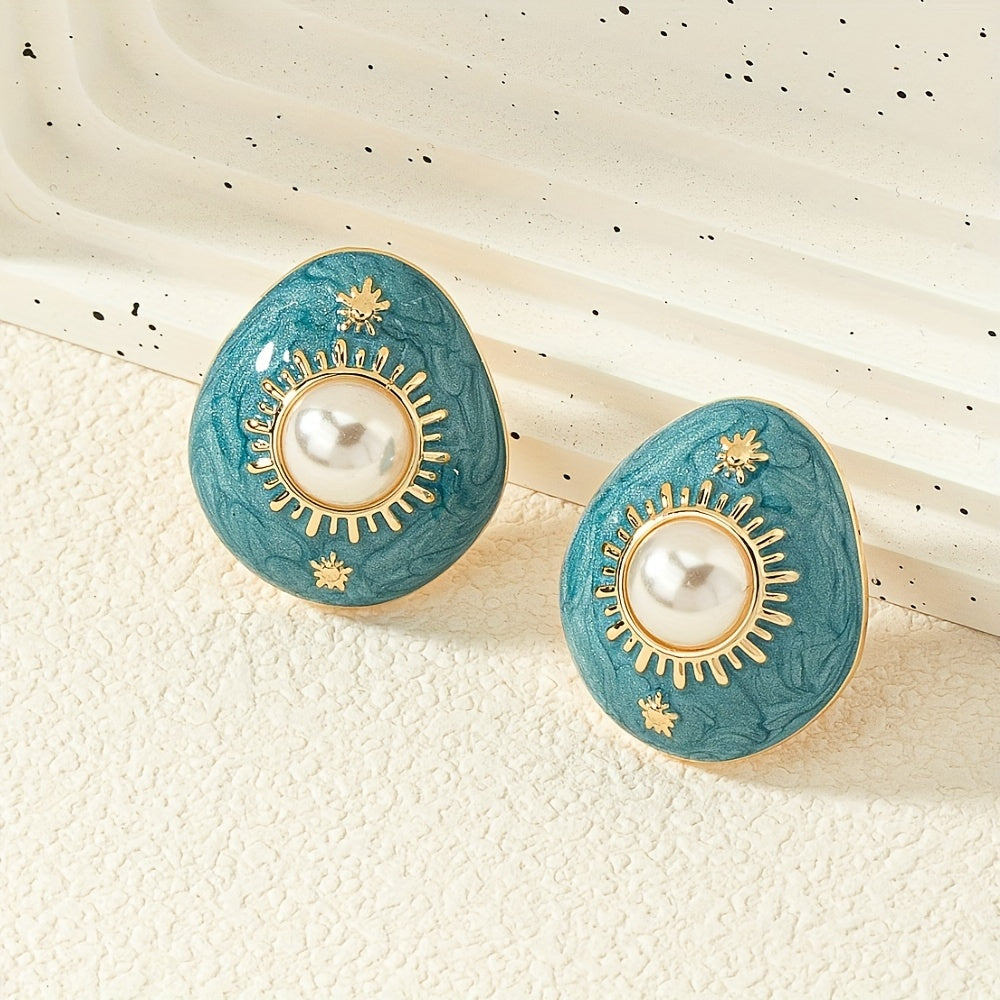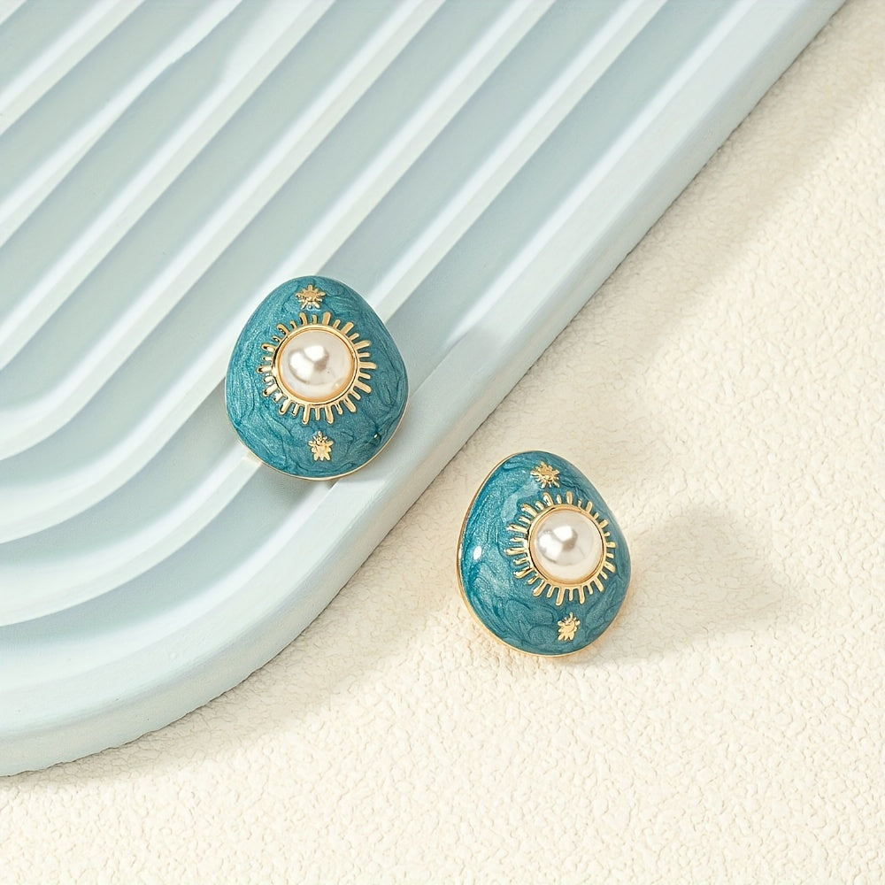 Add a touch of tribal charm to your daily wear with these sun and star enamel stud earrings. Featuring a pearl center and crafted from 18K golden plated copper with a 925 sterling silver needle, these earrings are perfect for Christmas season.
