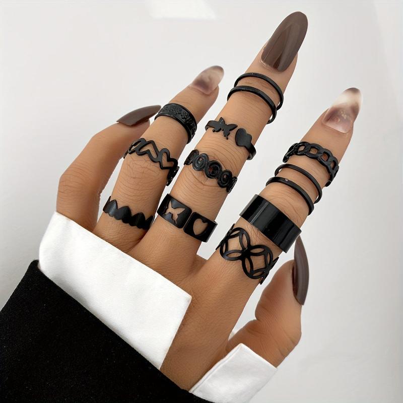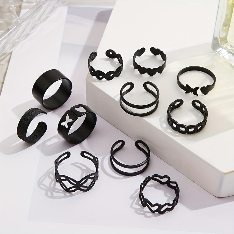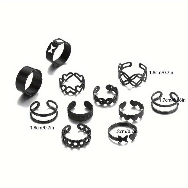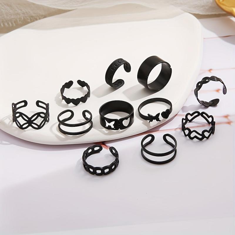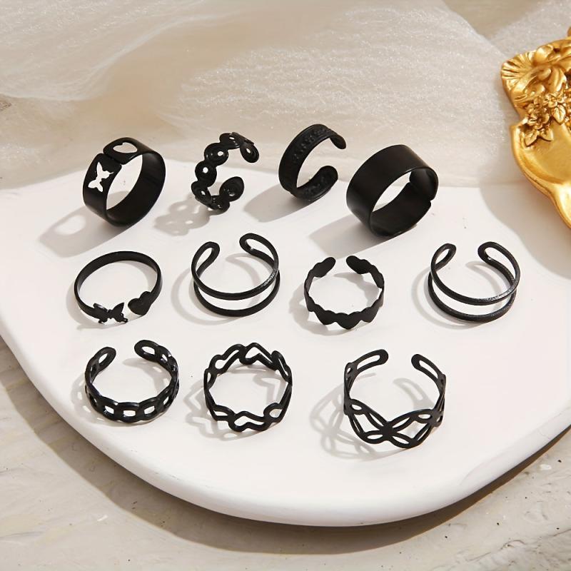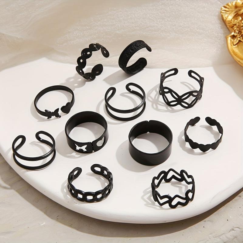 Add a touch of charm to your outfit with this 11-piece ring set featuring butterfly, heart, and geometric designs. Perfect for casual wear or vacation vibes.