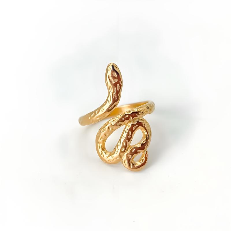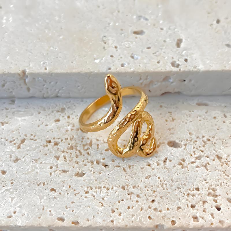 Elevate your style with this stunning 18K gold plated snake ring, featuring a hammered texture design. This versatile piece is perfect for casual wear or special occasions.