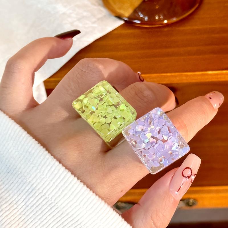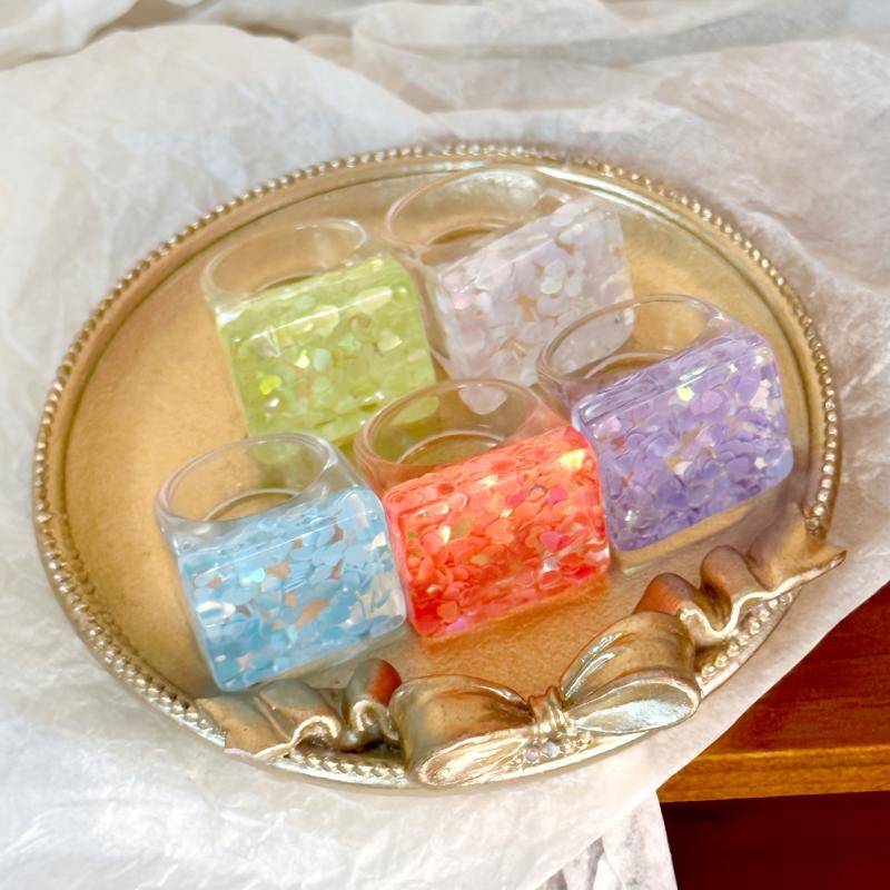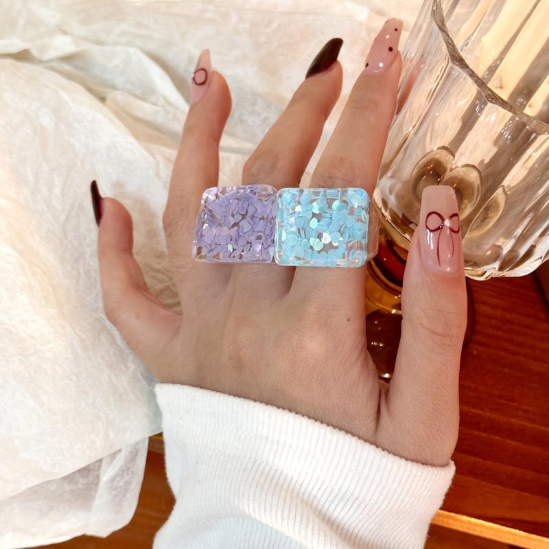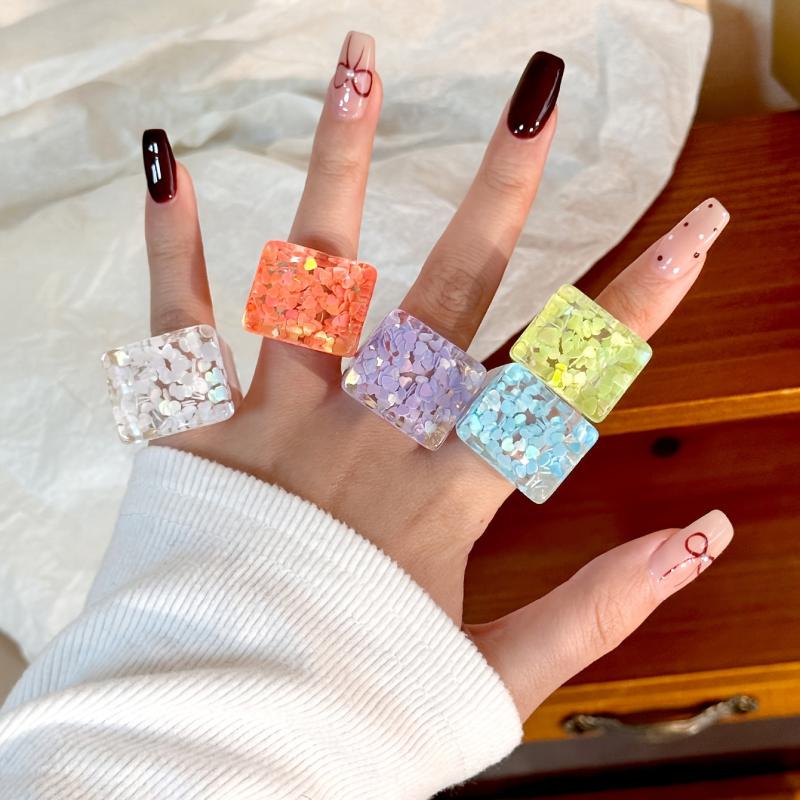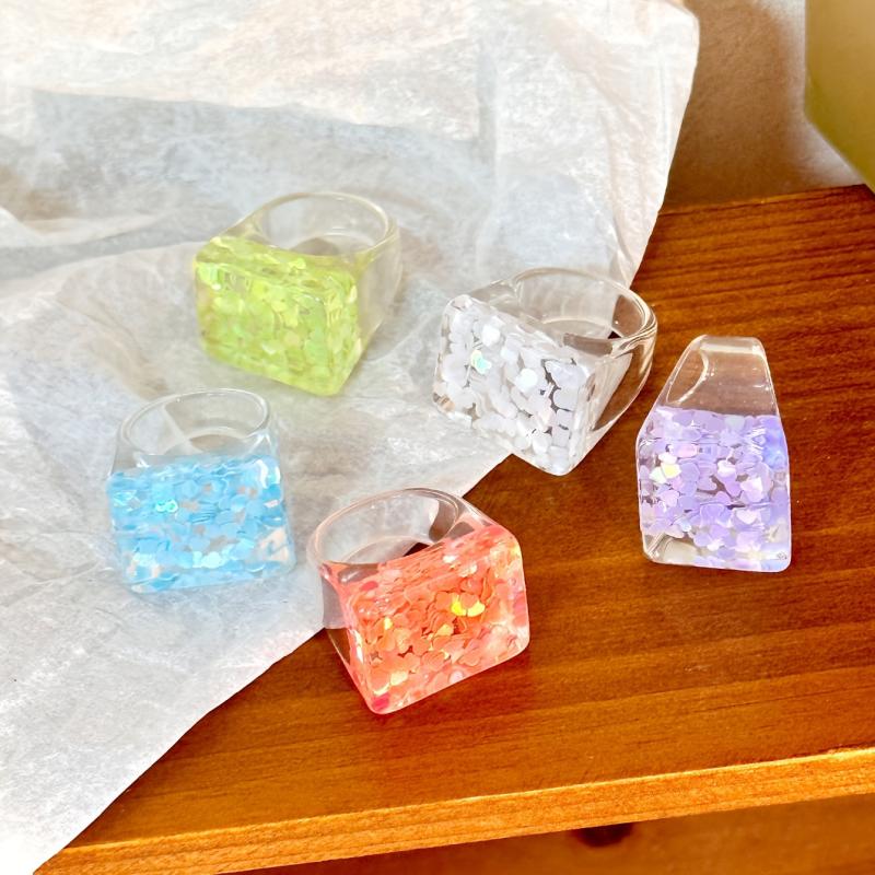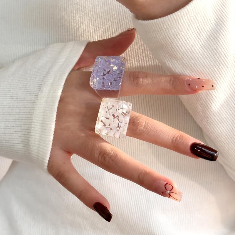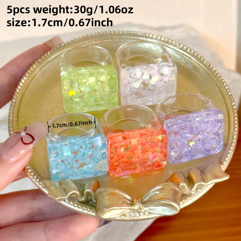 Elevate your everyday and vacation looks with this set of 5 resin stacking rings featuring transparent design with delicate floral accents. Perfect for adding a touch of charm and elegance to your outfits.