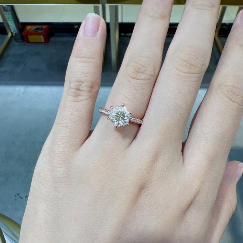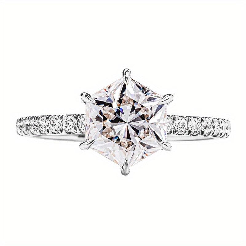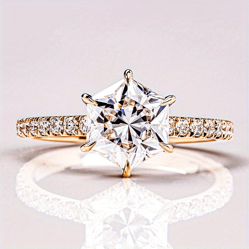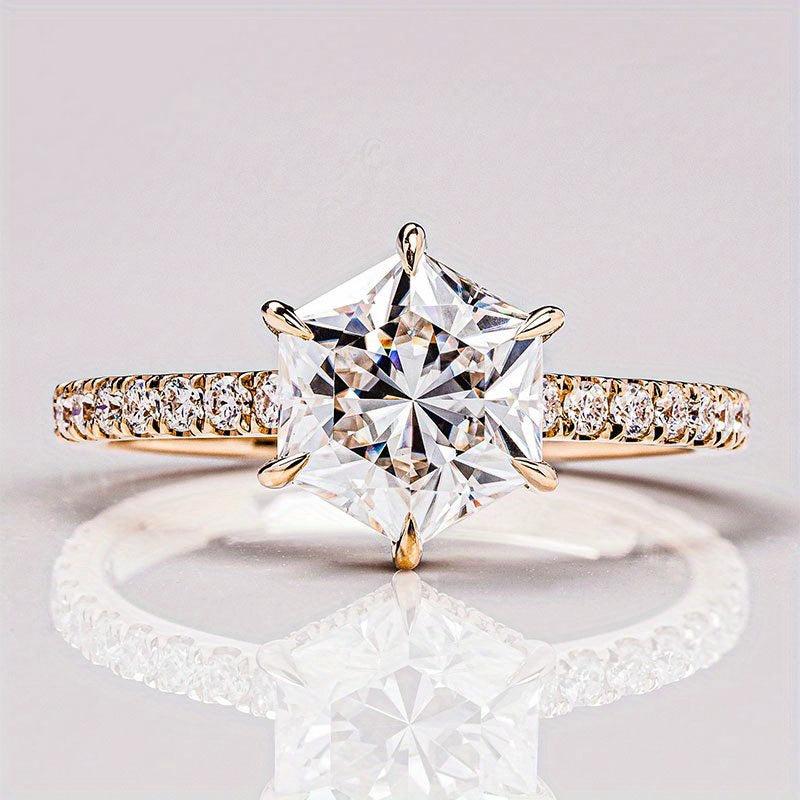 This stunning ring features a 7mm hexagonal Moissanite stone, set in a silvery plated 18k golden plated ring. Perfect for European and American women looking for an elegant engagement ring.