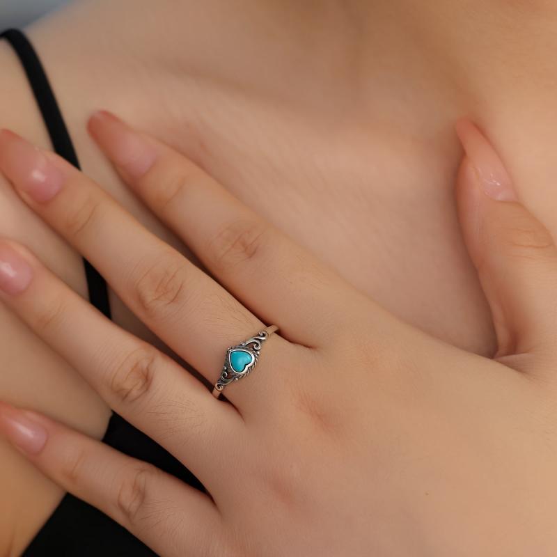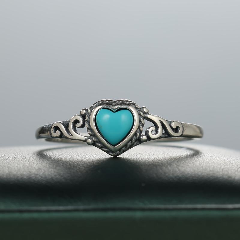 This 925 sterling silver ring features a retro design with a flower and heart motif inlaid with turquoise, symbolizing history and beauty. It makes a thoughtful gift for your loved one.