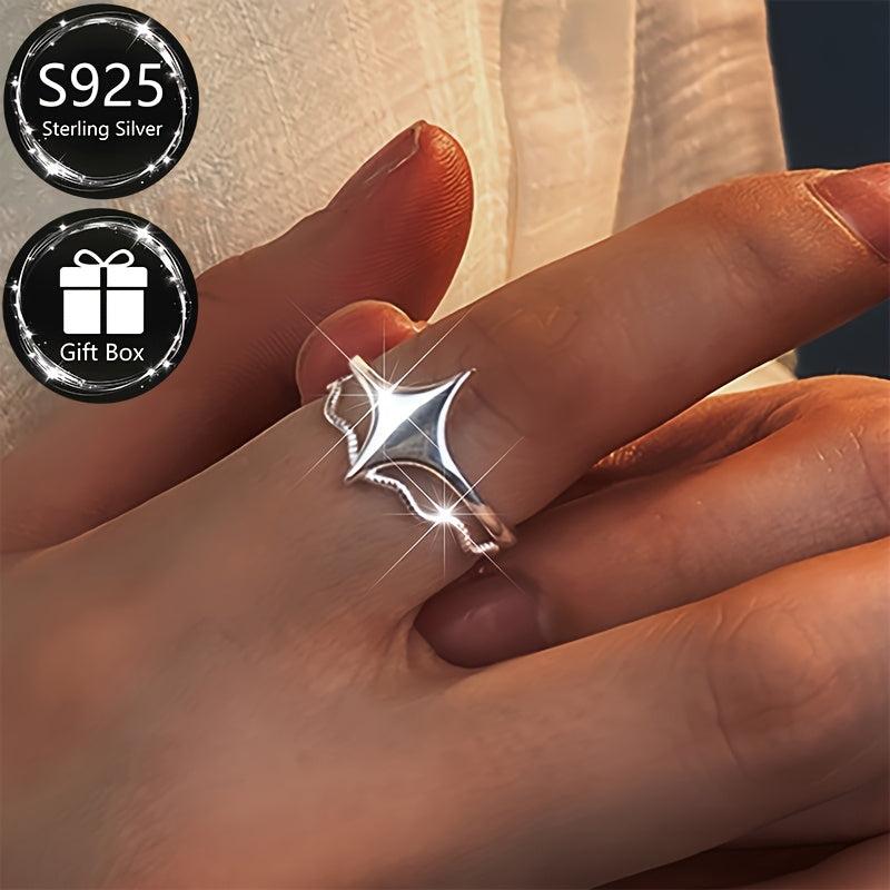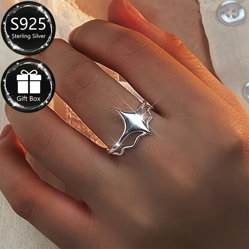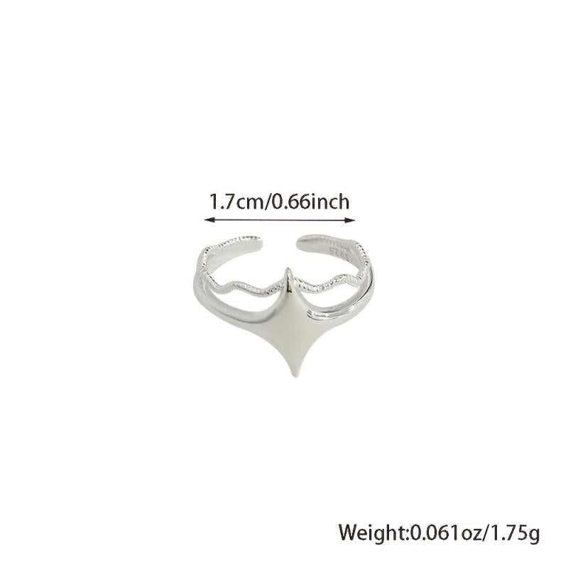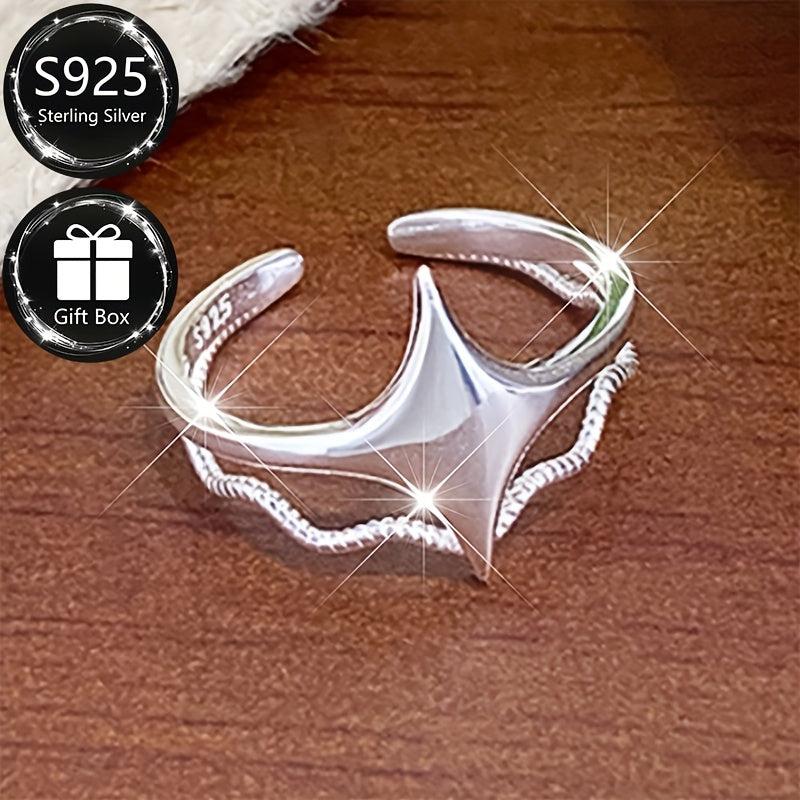 925 Sterling Silver Women's Adjustable Open Ring with Wavy Four Pointed Star