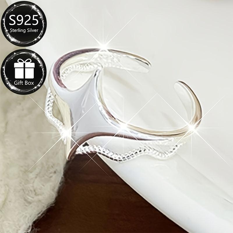 This women's adjustable open ring is made of 925 sterling silver and features a wavy four pointed star design. It is suitable for any occasion and adds a touch of elegance to your look.