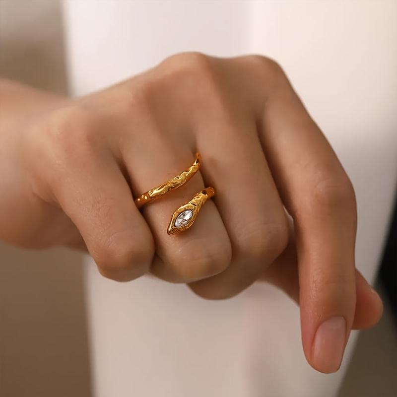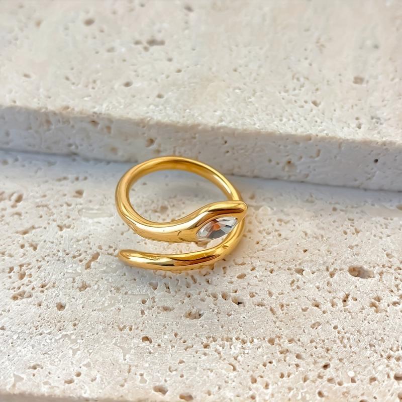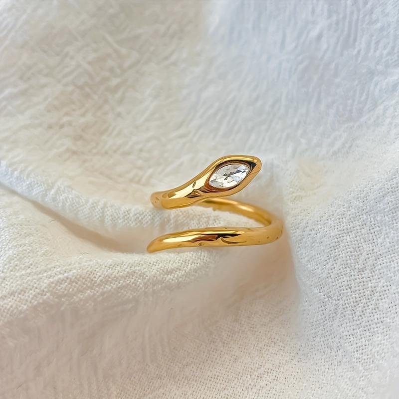 This unique snake ring features a golden tone stainless steel design with glass accents, making it perfect for casual attire and gift giving. It is adjustable and irregular in shape, ideal for daily wear.